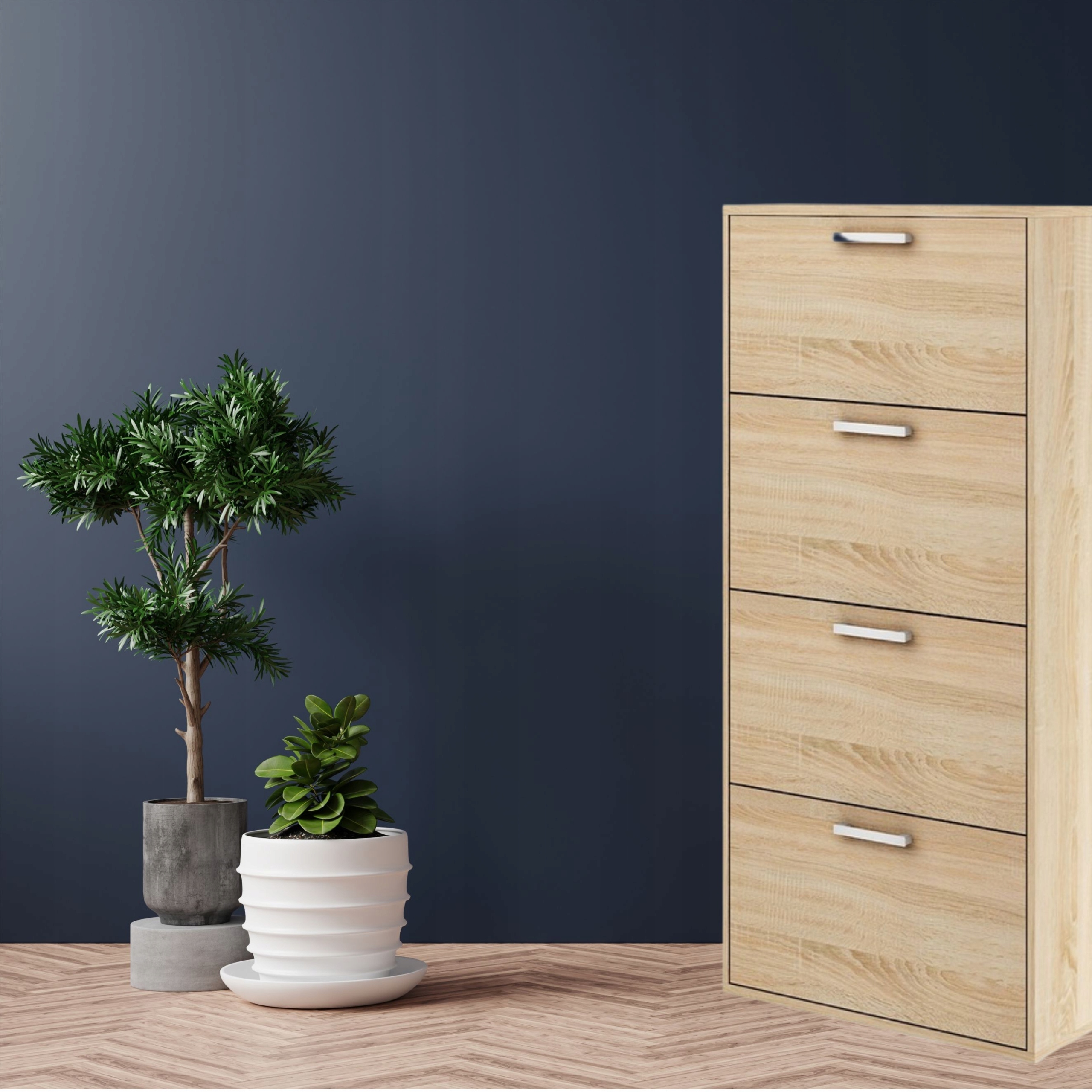 Чотири навісних відділення вміщають багато пар взуття. Шафа ідеально підійде в маленьку передпокій , але також у більшій, де ви можете поєднати інші меблі з нашої пропозиції. Сучасний стиль і елегантне оздоблення додадуть свіжості вашому інтер'єру.