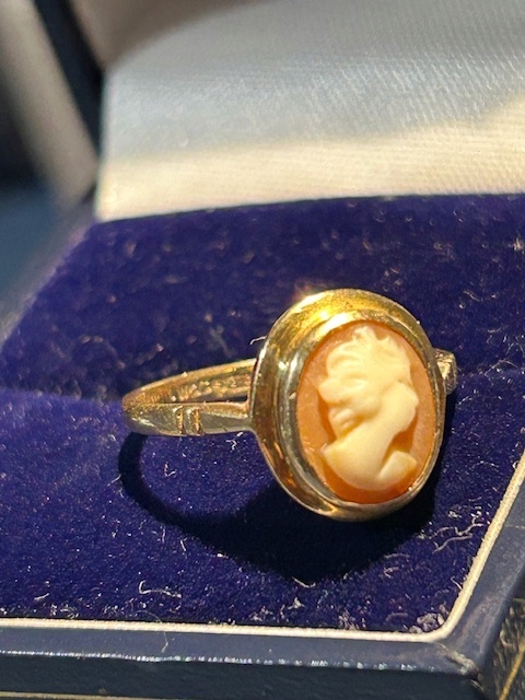 Прекрасне кільце, виготовлене з 9 -каратного золота з натуральною різьбленою камерою, що зображує жіночий профіль