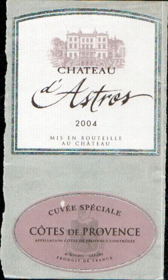 w438 Кот де Прованс. 2004 Шато Астрос. Формат прибл. 14 х 8 Етикетка оригінальна. Етикетка самоклеюча, її можна наклеїти на пляшку. Предметом продажу є оригінальна етикетка алкогольних напоїв (вино, горілка, лікери)