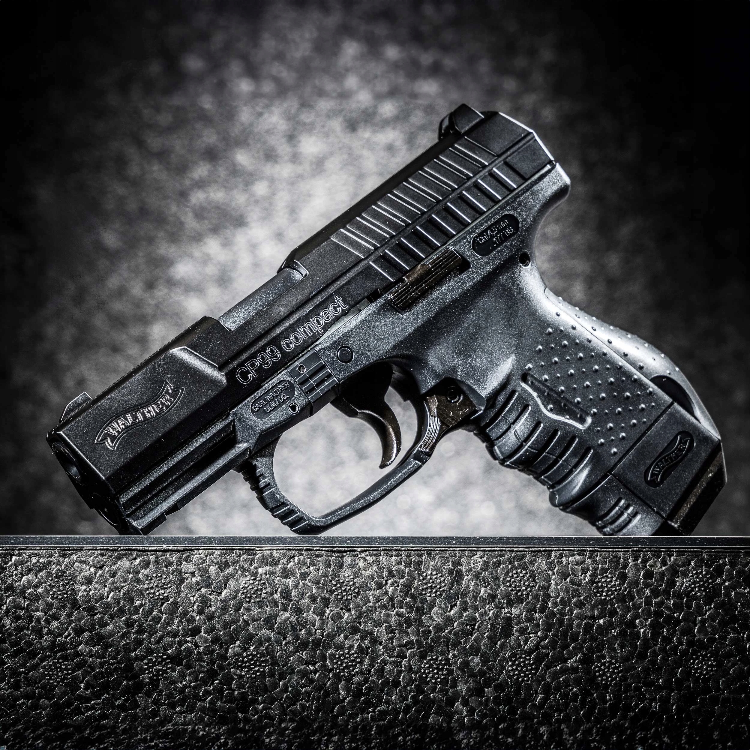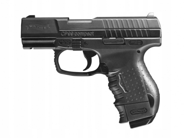 Walther CP99 Компактний 4,5 мм Blowback BB CO2-вірна пневматична репліка німецького пістолета, що не випускається, Walth P99, яка також є основним пістолетом польської поліції. Він характеризується чудовим пристосуванням і обробкою структури, в якій ми можемо розрізнити хеві -металевий замок (рухомий та полімерний скелет, посилаючись на будівництво оригіналу.