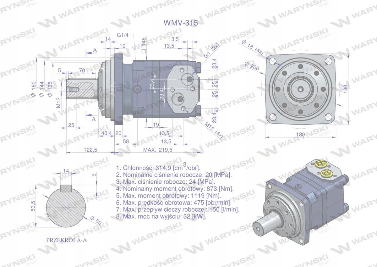 Орбітальний гідравлічний двигун WMV 315 см3/об (200 бар / макс. 240 бар / макс. миттєвий 280 бар) Waryński. Двигуни серії WMV мають компактну конструкцію, високий крутний момент і високу поглинаючу здатність. Можуть бути з'єднані паралельно або послідовно. Для досягнення більшого терміну служби рекомендовано, щоб оптимальні умови експлуатації були на рівні від 1/3 до 2/3 максимальних параметрів. Двигуни серії WMV відрізняються плавністю роботи, економічністю, передачею високих поздовжніх і поперечних навантажень.