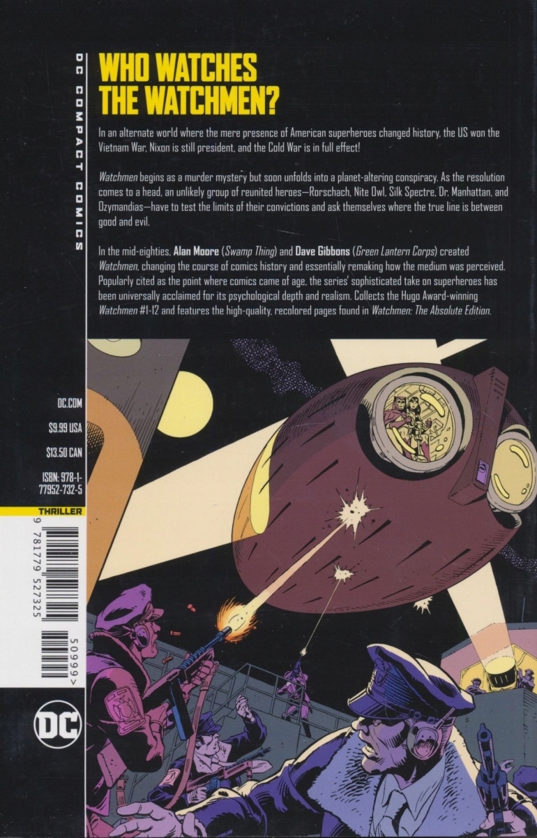 Графічні романи, які можна читати де завгодно: DC Compact Comics збирає бестселери, найбільш культові історії DC у новому розмірі! В альтернативному світі, де одна лише присутність американських супергероїв змінила історію, США виграли війну у В’єтнамі, Ніксон досі є президентом, а холодна війна триває повною мірою! Вважаючи найкращим графічним романом в історії медіа, WATCHMEN починається як таємниця вбивства, але незабаром розгортається в змову, яка змінює планету. Групі возз’єднаних героїв — Роршаху, Нічній Сові, Шовковому Привиду, доктору Мангеттену та Озимандіасу — належить перевірити межі своїх переконань і запитати себе, де справжня межа між добром і злом. Збирає Watchmen #1-12, повну історію.