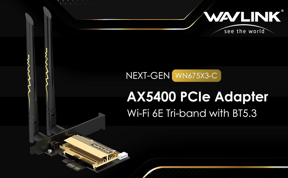 Wavlink Tri-діапазон PCI-E-це бездротовий адаптер AX5400, призначений для настільних комп'ютерів, що підтримує останню технологію Bluetooth 5.3. Ця бездротова карта забезпечує стабільний сигнал, високу швидкість та відмінну продуктивність вашого настільного комп'ютера. Пристрій відповідає специфікації 802.11ax, яка дозволяє підтримувати діапазони 2,4 ГГц, 5 ГГц та 6 ГГц. Оснащений технологією 1024-QAM та Mi-MIMO, модель WN675x3-C надсилає бездротові сигнали швидше та ефективніше, коли використовується в поєднанні з маршрутизатором, що підтримує технологію MU-MIMO. Насолоджуйтесь вдосконаленою комунікацією та оптимізованою бездротовою ефективністю завдяки цьому вдосконаленому бездротовому адаптера.