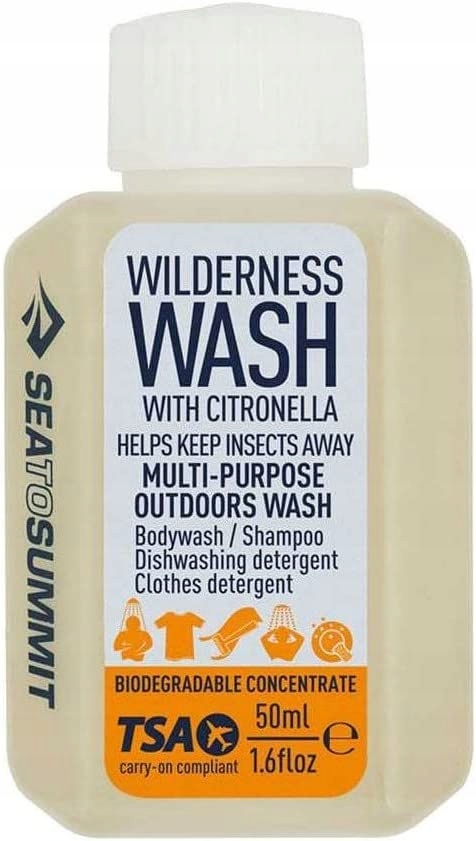 Wilderness Wash Citronella - це концентрована рідина, що щадить тканини та шкіру, ефективно миє посуд і видаляє плями з тканин. Продукт доступний у рідкій формі в різних розмірах упаковок з ароматом цитронелли та олії сандалового дерева, які допомагають відлякувати комах та усувати неприємні запахи. Незважаючи на те, що рідина біологічно розкладається, ми рекомендуємо використовувати її на відстані принаймні 100 м від водотоків.