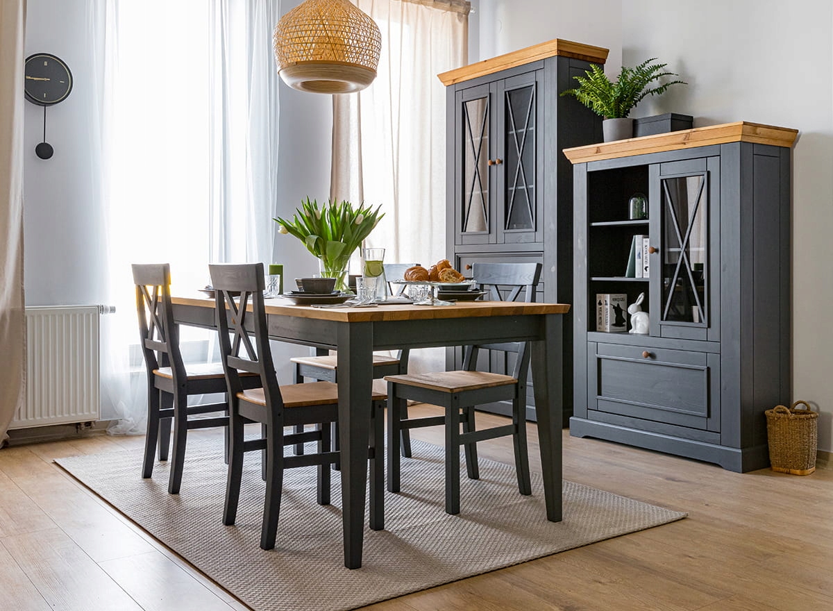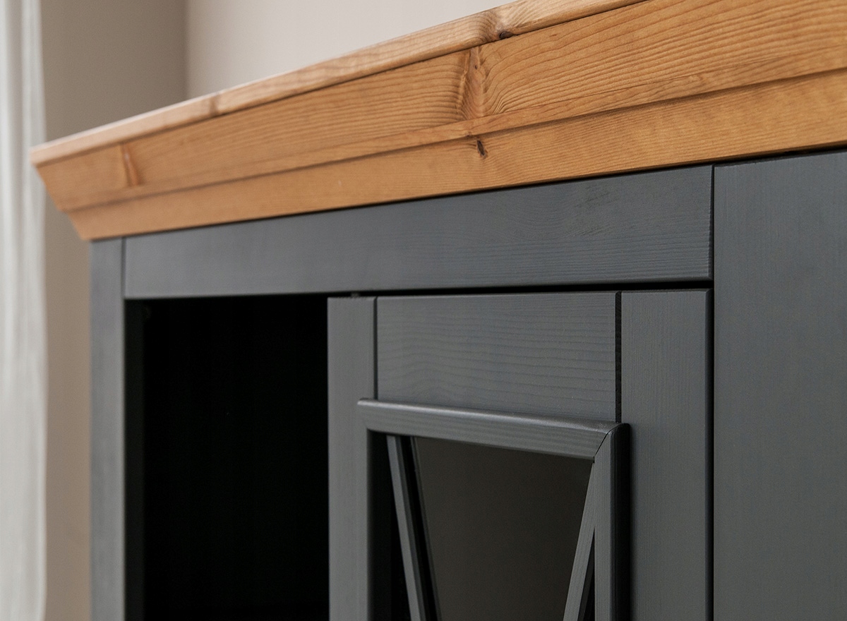У верхній частині вітрини фрезерований вінок. Це створює широку стільницю, на якій можна розмістити прикраси, фотографії в рамках або лампу. Стільниця виконана в кольорі натурального дуба, що привабливо контрастує з темним графітово-сірим корпусом і нижнім краєм вітрини. Дані елементи пофарбовані екологічною фарбою на водній основі з частковим покриттям, завдяки чому структура деревини залишається злегка помітною. Витончений, гармонійний візерунок з сучків і деревних відтінків також прикрашає стільницю. Ручки шафи мають форму декоративної шишки. Вони мають колір натурального дуба, тому підходять до кольору стільниці, створюючи єдине ціле.