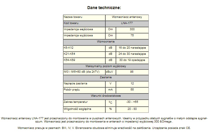 WZMACNIACZ antenowy LNA-177 DVB-T MPEG-4 do 150km