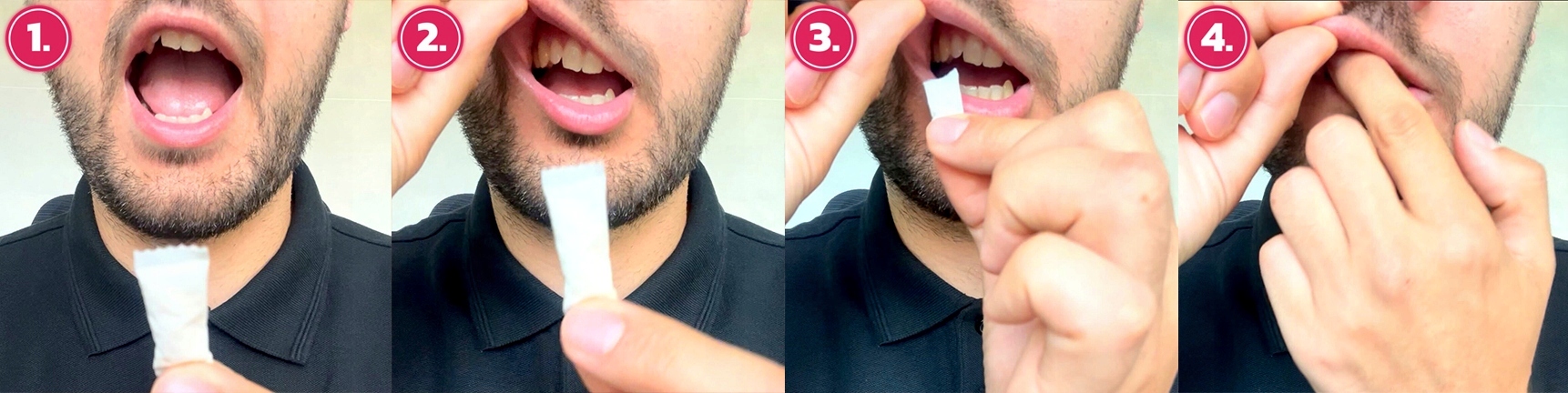✔ Розмістіть сумку між гумкою та губою, не жуєте і не ковтайте. Кофеїн, тримайте максимум 30 хвилин.