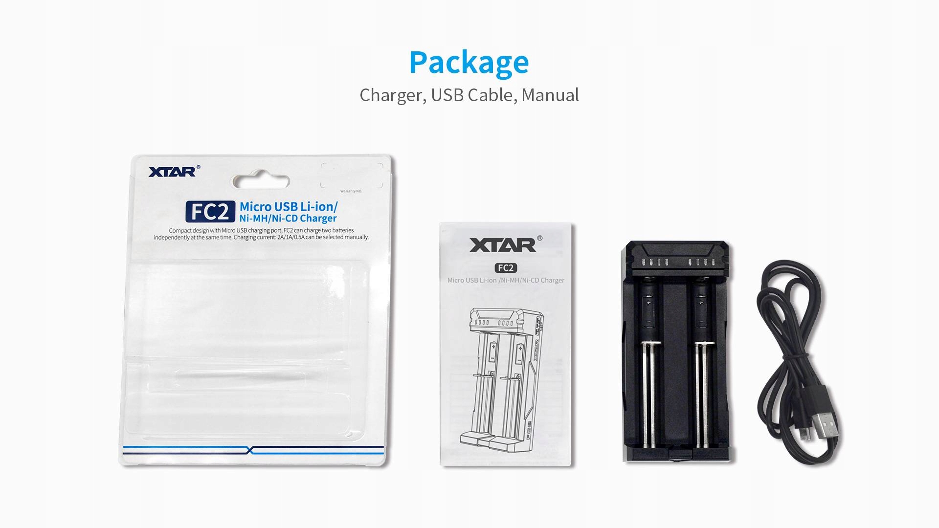 Зарядний пристрій XTAR FC2 постачається з кабелем micro USB. Для набору потрібен блок живлення, наприклад, для телефону або комп'ютера з вільним USB портом. Рекомендований блок живлення 3 А з функцією QC 3.0 (5 В/3 А | 9 В/2 А | 12 В/1,5 А).