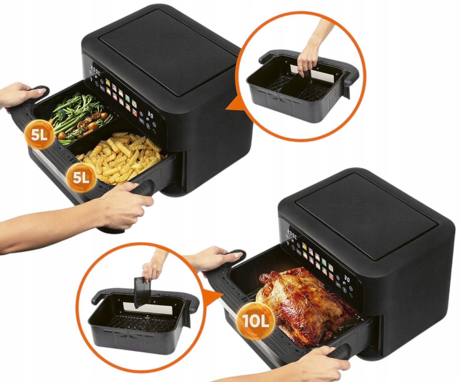Мрієте про хрустку картоплю фрі, соковиту курку та запечені овочі – без грама жиру? Тепер це можливо! Завдяки фритюрниці без жиру з двома незалежними і, що важливіше, асиметричними камерами, ви можете готувати дві страви одночасно, економлячи час, електроенергію та калорії!