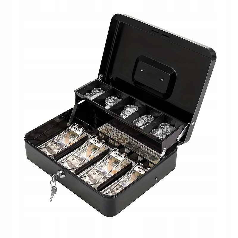 Грошова шкатулка для каси німецької марки була розроблена для безпечного зберігання монет, банкнот, а також квитанцій або чеків. Модель ST-CB-90R-це відмінний продукт для готелів, ресторанів, офісів, офісів лікаря та приватних користувачів.