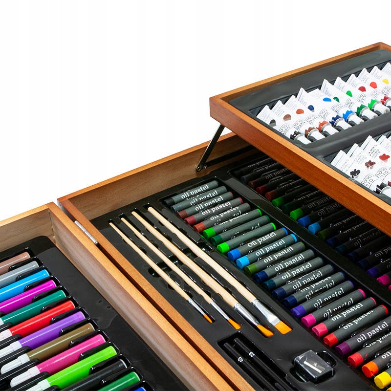 Високі аксесуари упаковані в зручну дерев’яну валізу з ручкою, що сприяє. Елегантно зроблена дерев’яна валіза- чудова ідея для успішного подарунка, валіза розгортається- у неї є чотири рівні з елементами для фарбування.