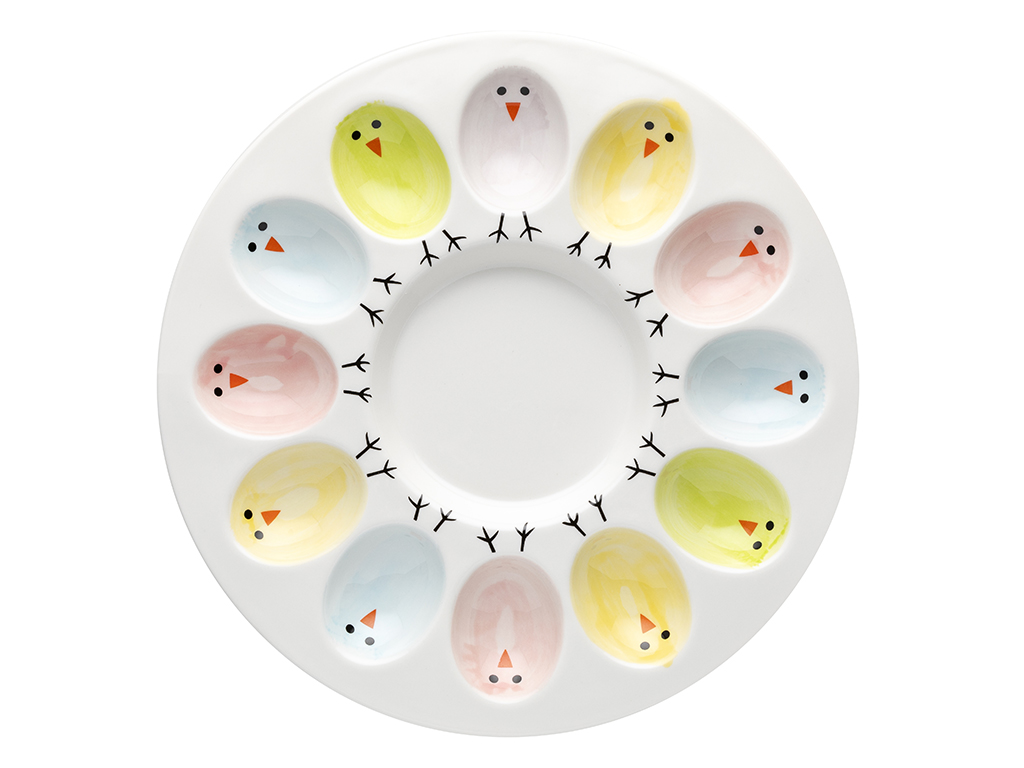 Тарілка для яєць Kolorowe Kurki від Florina виготовлена з порцеляни. Має 12 отворів для яєць. Його можна мити в посудомийній машині. Дозволяє демонструвати круті або м’які яйця. Ідеально підходить для будь-якого столу.