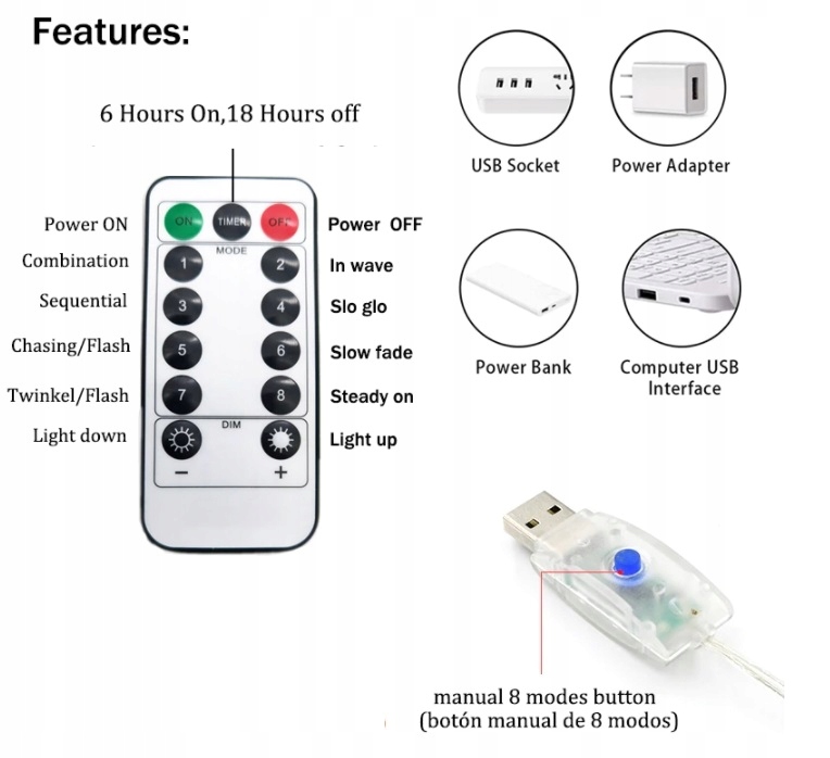 - Пульт дистанційного керування з 8 режимами освітлення Батареї включені