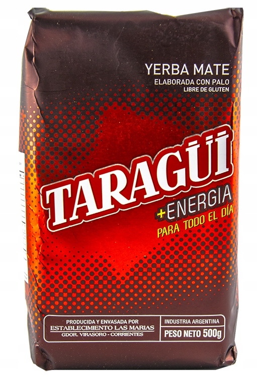 Флагманський продукт плантації Las Marias - найбільшої плантації в Аргентині. Taragui Energia є найбільш стимулюючим йерба мате на ринку - він містить вдвічі більше матеїну, ніж традиційний йерба мате Taragui Con Palo. Зібраний в середині літа, завдяки цьому він зобов'язаний своєю надзвичайною силою. Він складається з листя і паличок без будь-яких добавок і сушиться без використання диму (sin humo). Цей йерба мате точно зарядить вас енергією на цілий день!