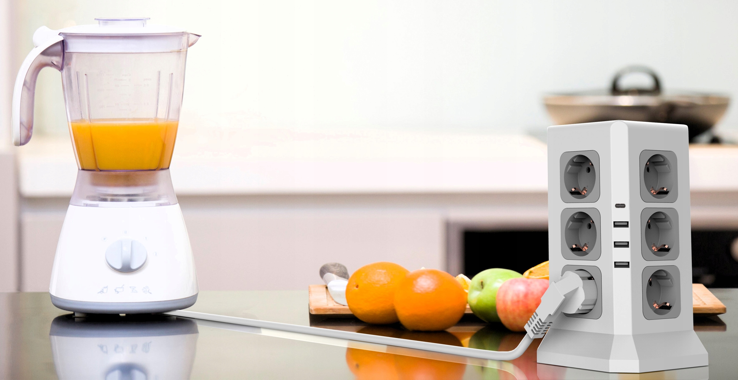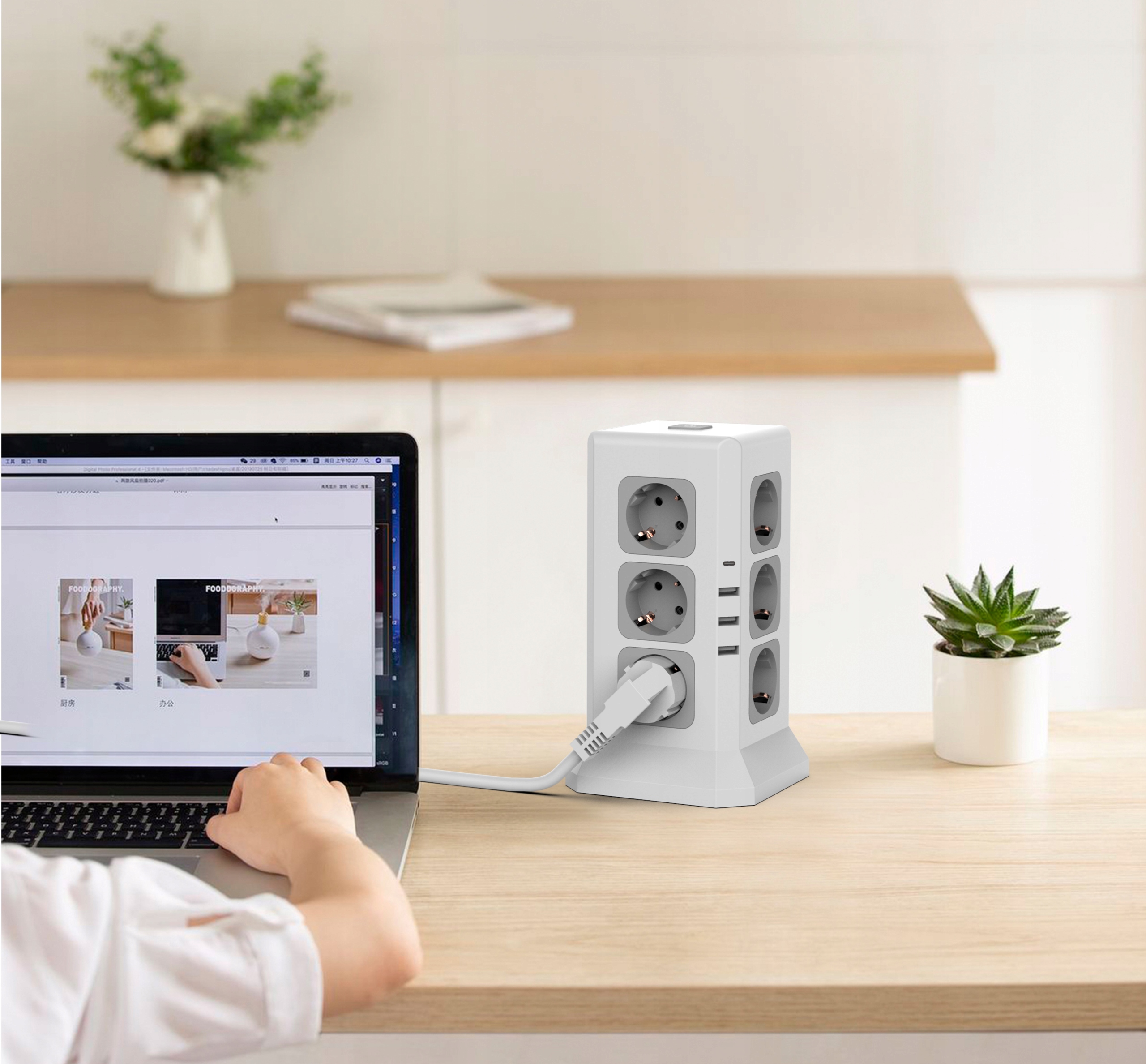 - 3 порти USB-A + 1 порт USB-C ідеально підходять для невеликих пристроїв. Незалежно від того, перебуваєте ви на кухні, у вітальні чи спальні, вежа є ідеальним рішенням для ваших потреб у електроенергії. На кухні ви можете живити різні прилади, такі як міксер, кавова машина, тостер.