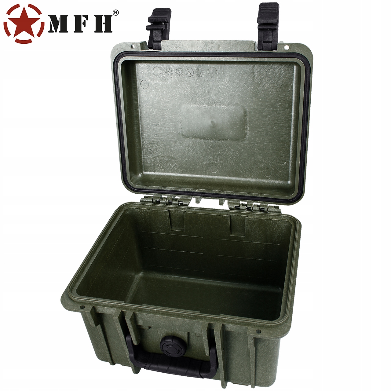 Універсальний, водонепроникний транспортний кейс від відомої німецької компанії MFH - чудовий міцний контейнер для безпечного транспортування обладнання, чутливого до ударів, ударів, екстремальних температур і потребує захисту від води - зброї, електронного обладнання чи оптики.