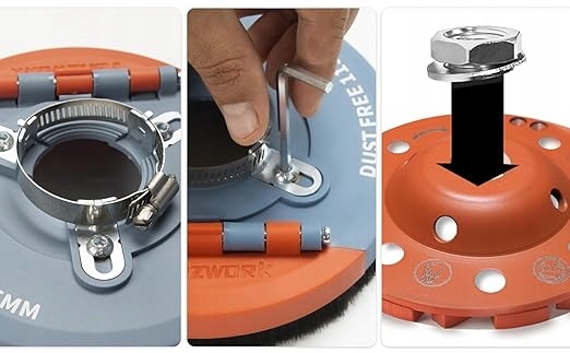 Насадка для відведення пилу FANZWORK перетворює вашу кутову шліфувальну машину від 115 мм до 125 мм на високоякісну шліфувальну машину для бетону всього за кілька хвилин. Завдяки регульованому з’єднанню його можна використовувати практично з будь-яким пристроєм, доступним на ринку.