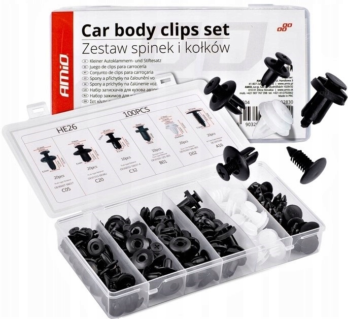 - Універсальний набір із 100 штук різноманітних затискачів, шпильок, автомобільних засувів для кріплення автомобільної оббивки, крил, бамперів, дверей.