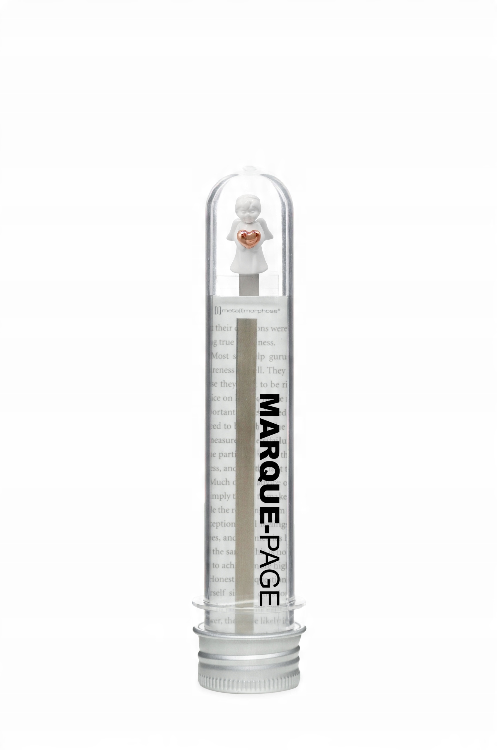 Красива закладка з білим ангелом, який тримає в руках серце з рожевого золота.