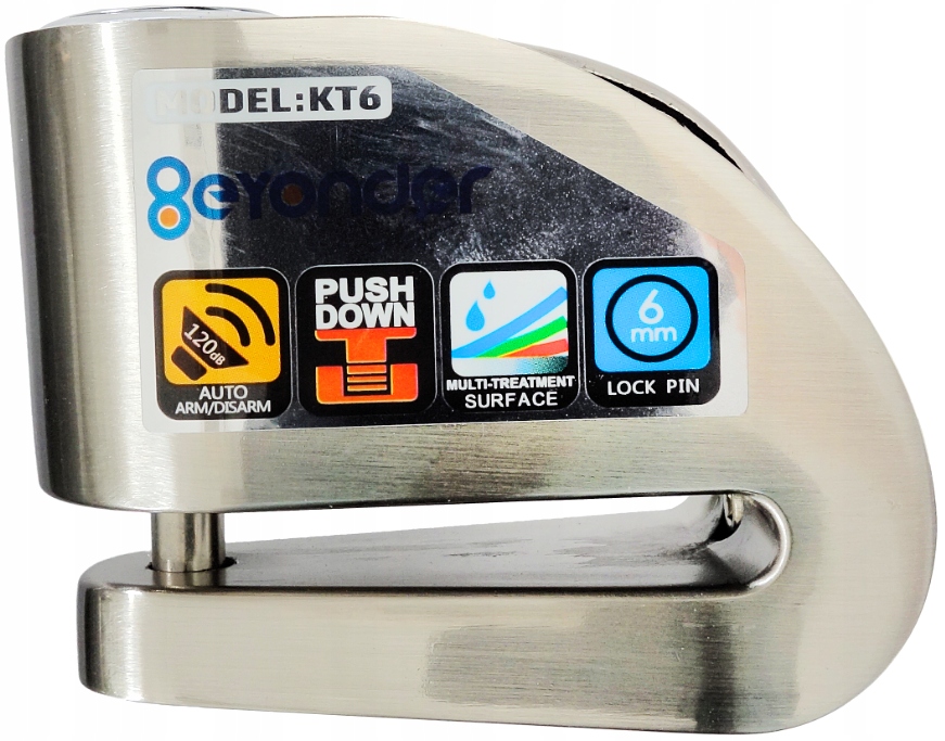 Блокатор гальмівного диска з вбудованою сигналізацією з інтенсивність звуку 120 дБ з можливістю налаштування параметрів ON/OFF сирени. Замок з нержавіючої сталі та водонепроникні електричні компоненти гарантують захист від корозії та надійність за будь-яких погодних умов. Замок оснащений довговічною та екологічно чистою літієвою батареєю. Захист фіксує колесо за допомогою штифта діаметром 10 мм, що запобігає руху та переміщенню мотоцикла чи скутера.