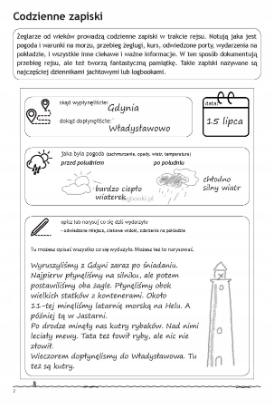 Книга призначена для дітей віком приблизно 7-9 років. Він містить завдання з малювання (намалюй, розфарбуй, з’єднай точки), текстові завдання (знайди слова, опиши), а також запропоновані дії на борту яхти. Крім того, він містить місце для збору штампів, наклейок і записів про відвідані місця та зустрічі людей.