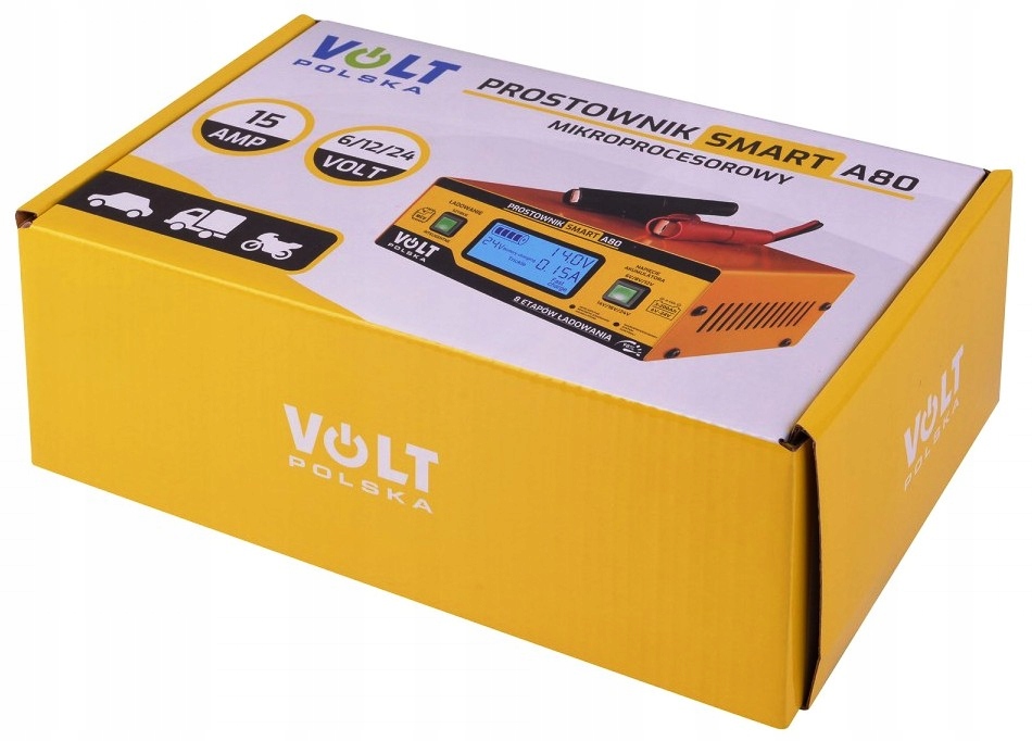 Випрямляч SMART 6V/12V/24V 15A A80 від VOLT Polska є першим зарядним пристроєм на ринку з мікропроцесорна система керування та керування за технологією ШІМ з можливістю заряджання акумуляторів до 24В та можливістю вибору нестандартних типів напруги акумуляторів, які розумно та спеціально підберуть відповідні параметри, забезпечуючи Ваш розряджений і залишений акумулятор буде відновлено.