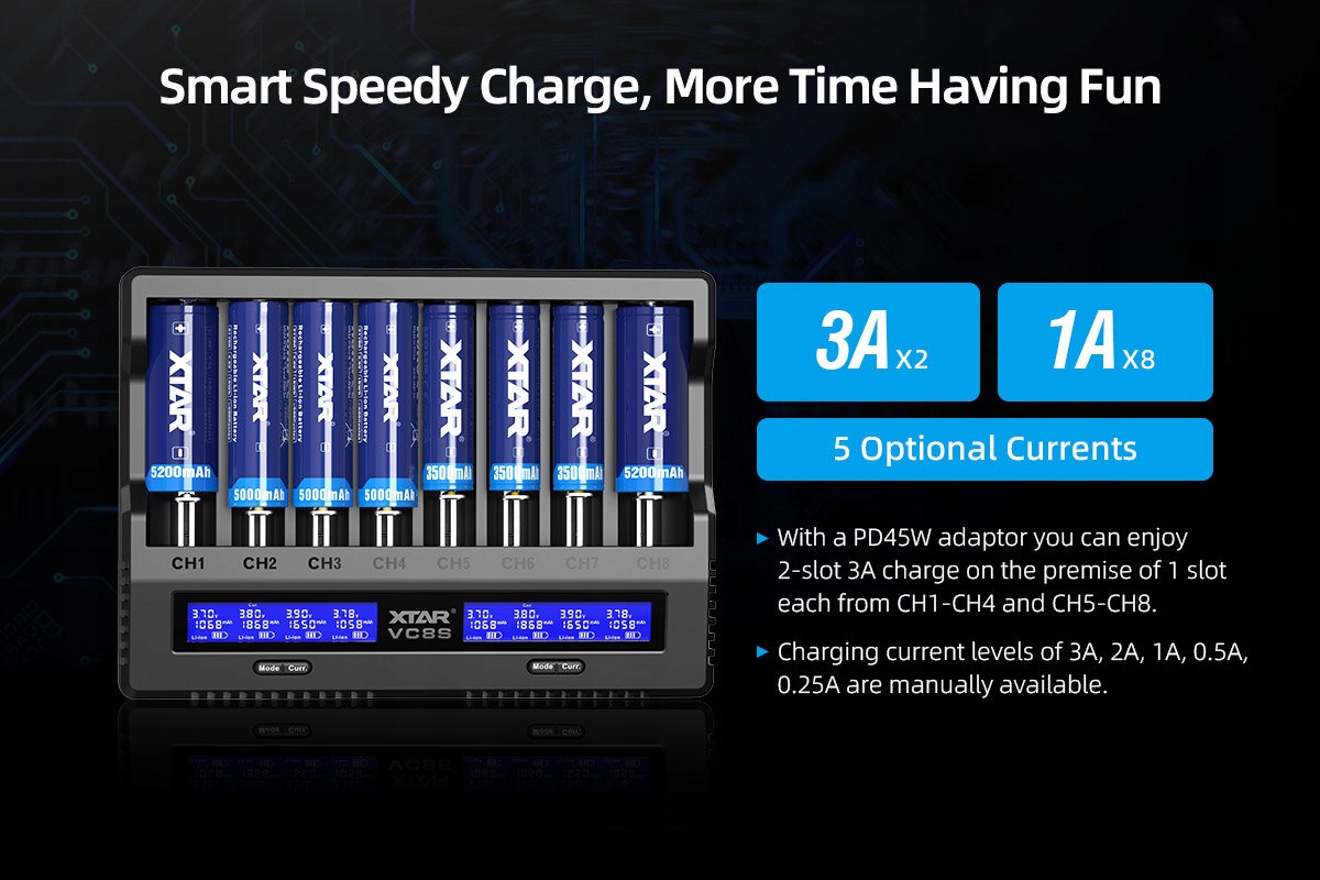 Поставляється із зарядним пристроєм Xtar VC8S поставляється за допомогою кабелю USB-C - USB-A. У комплект не входить блок живлення. Для живлення зарядного пристрою потрібен зарядний пристрій зі стандартом QC3.0 (9V / 2A. Однак для повного використання можливостей зарядного пристрою рекомендується зарядний пристрій, сумісний зі стандартом PD, з мінімальною потужністю 45 Вт. Можна використовувати слабкіше джерело живлення, VC8S регулюватиме зарядний струм відповідно до потужності джерела живлення.