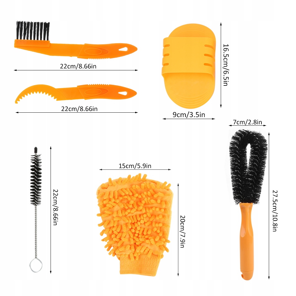 1,8 шт. Щітка для чищення велосипеда, включаючи щітку для чищення шин, рукавички для чищення велосипеда, дротяна щітка для тонких деталей, кутова сталева щітка, повна щітка з ручкою, чорно-оранжево-жовтий скребок зі зірочками, чорно- оранжево-жовта щітка для миття, цих інструментів достатньо, щоб допомогти вам добре почистити велосипед без необхідності купувати додатковий інструмент для чищення. 2. Це єдиний у своєму роді спеціальний набір для чищення велосипеда. Пухові рукавички: зручніші та чистіші, ніж звичайні рукавички. Щітка для шин: форма щітки підходить для велосипедних шин, ергономічний дизайн, економія праці, носіння на руці може перетворити руку на кисть. Універсальна щітка з ручками: втулка для чищення, великий зубчастий диск із великою поверхнею бруду, очисні ободи та спиці та деякі тупики рами, багатофункціональна щітка для комплексного чищення. 3. Скребок зі зірочками: Використовуйте гаки зі зірочками, щоб видалити плями та покращити чистоту. Щітка для миття: очищення кожного глухого кута, який важко очистити. Дротяна щітка для країв і кутів: більше деталей для очищувача. 4. Різні щітки, які використовуються на різних частинах велосипеда для ефективного та легкого видалення бруду з важкодоступних місць. 5. Велосипед – наш найкращий друг, після довгої подорожі велосипед був брудним, у цей момент ми повинні були допомогти прибратися та відпочити. Очистившись, ми знову вирушили в дорогу. Набір для чищення можна використовувати для базового обслуговування, коли він не використовується, або навіть як щоденний інструмент для домашнього прибирання.