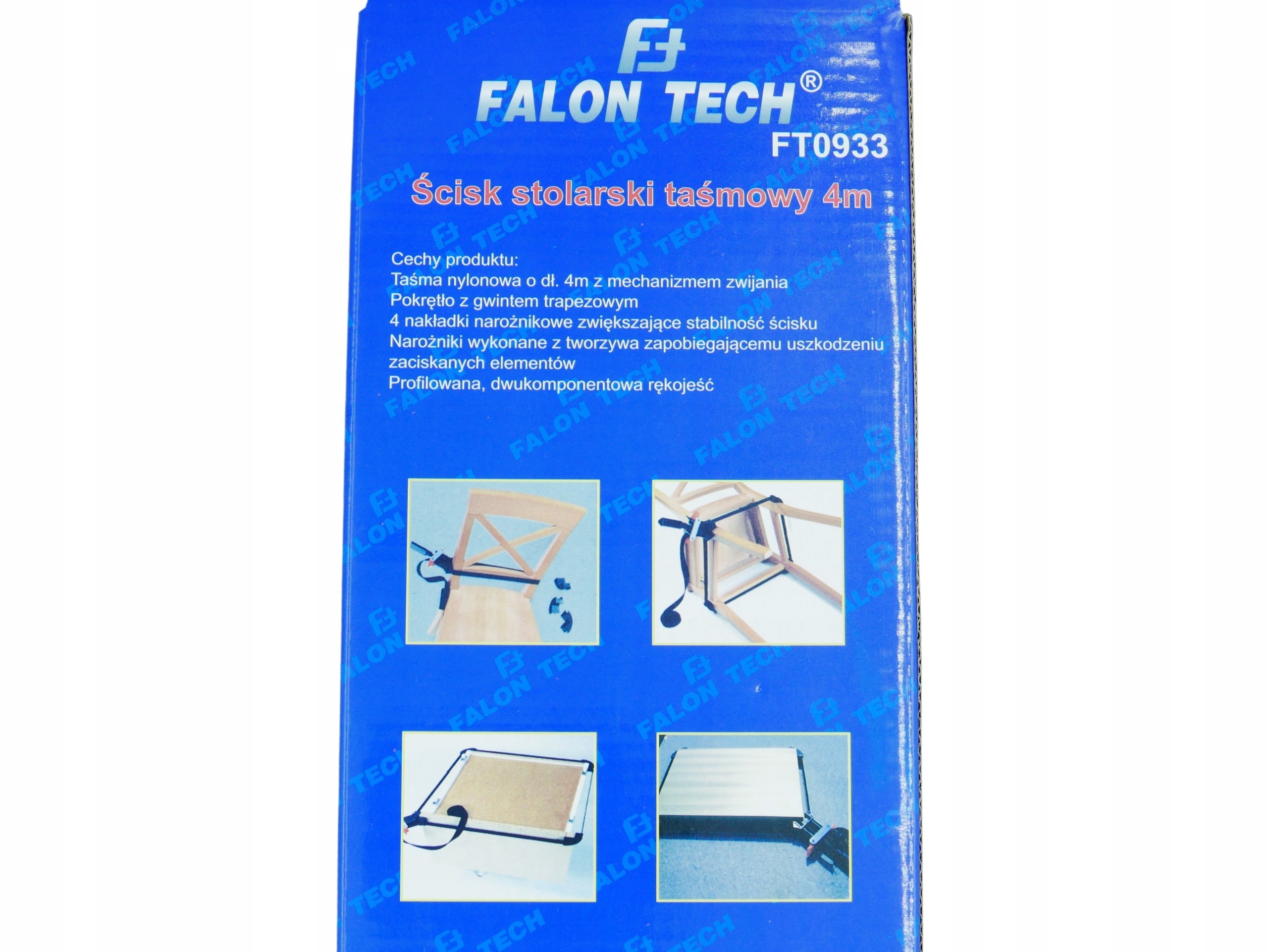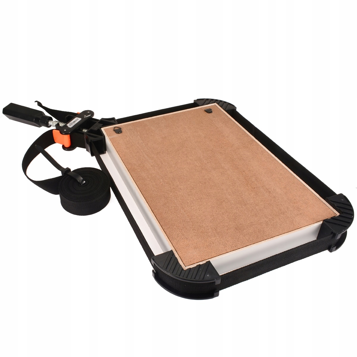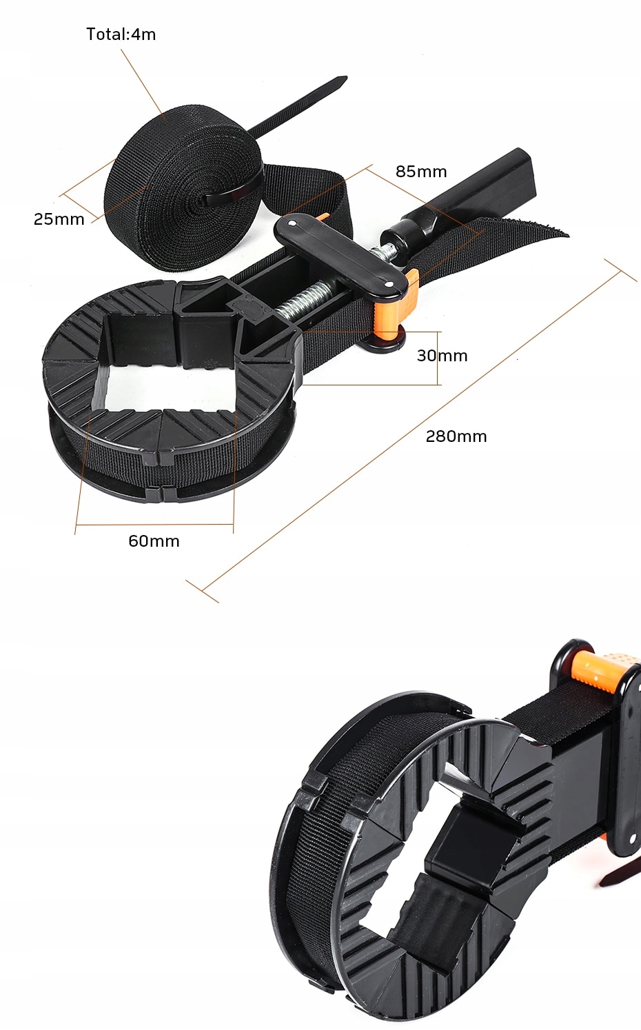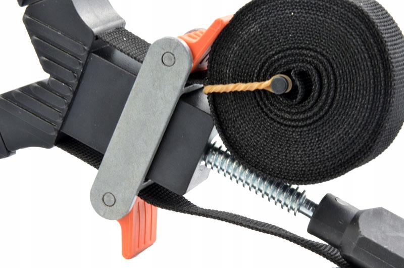 Скоба столярна стрічка дозволяє запресовувати склеєні великогабаритні елементи обхватом до 4 метрів з дотриманням кута 90 градусів. Інструмент підходить для склеювання рам, стільниць, ящиків, столів тощо.