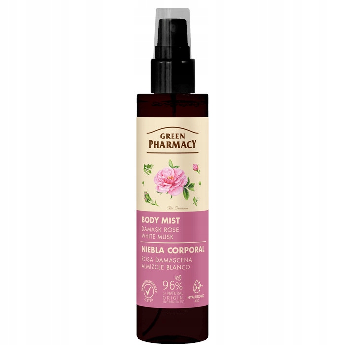 Зелена аптечна розпилення тіла Дамаск Роуз і білий мускус - це делікатне поєднання витонченого запаху троянди та тонких, злегка порошкоподібних нот білого мускусу. Це створює справжній ритуал для тіла і душі, огортаючи вас світлим, романтичним туманом, який дає вам відчуття делікатності та гармонії.