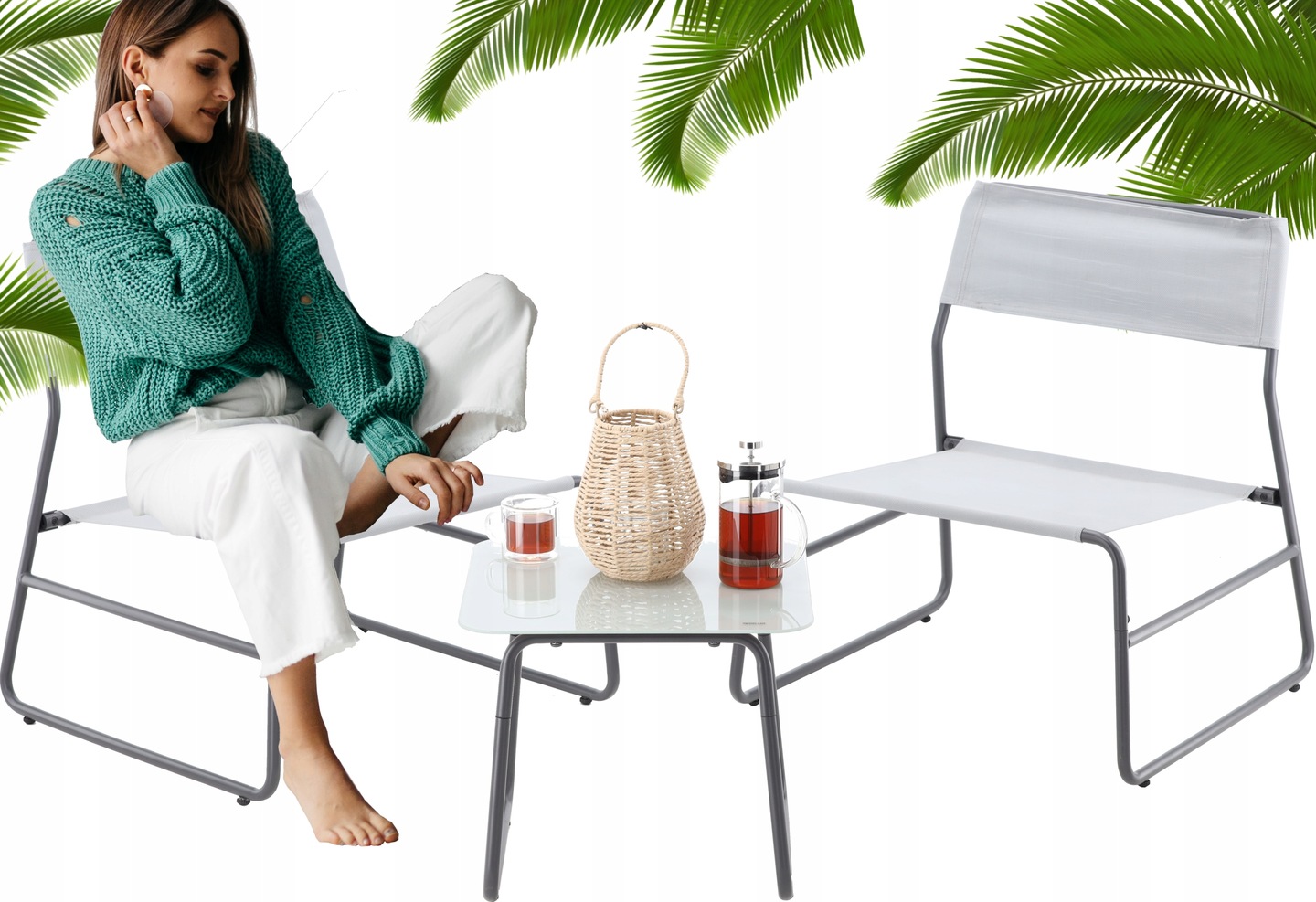 Меблі виготовлені з високоякісної сталі та текстильного матеріалу, стійкого до мінливих погодних умов. Незважаючи на невелику вагу, вони надзвичайно стабільні, що гарантує тривале використання.