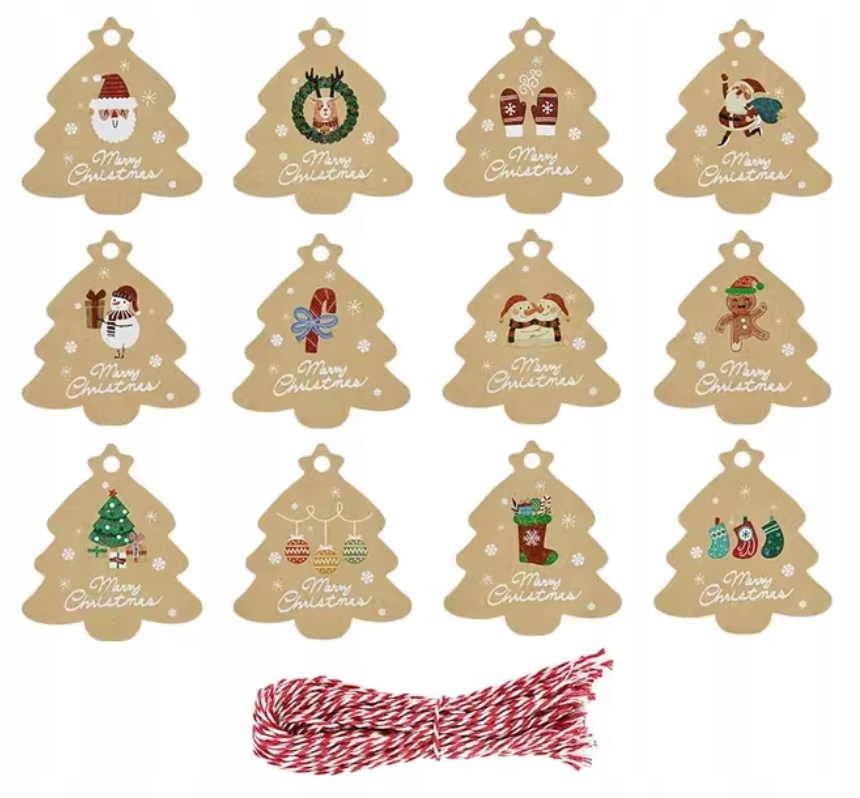 - Матеріал: Різдвяна бірка з крафт-паперу виготовлена з високоякісного крафт-паперу, міцного та стійкого до зминання. Екологічно чистий і нетоксичний, його нелегко наносити. Мотузка зроблена з французької нитки, яка є синтетичною та може використовуватися протягом тривалого часу.