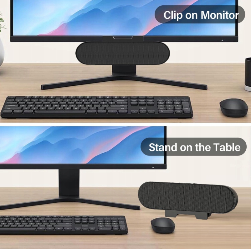 ♫ Екранний динамік, що кріпиться, ідеально підходить над або під екраном комп’ютера. 3,5-міліметрові роз’єми AUX і роз’єми для навушників відсутні, що звільняє місце на столі та усуває безлад із кабелями.