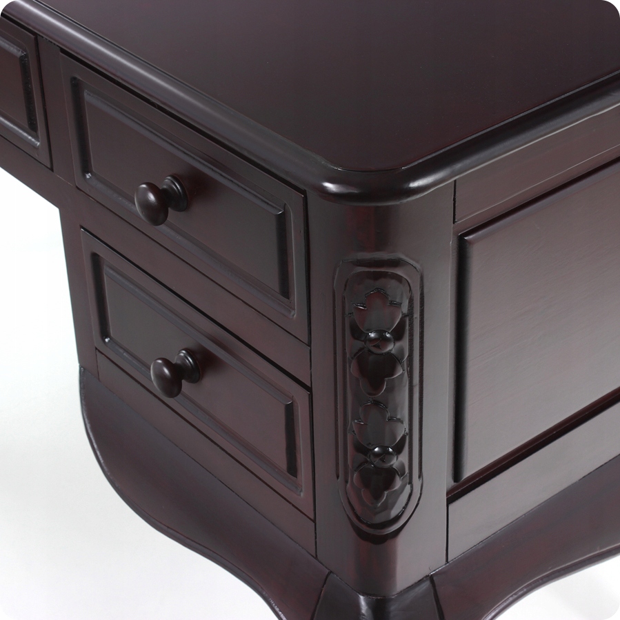 Предметом цієї пропозиції є один із наших найпопулярніших столів у темному кольорі червоного дерева! Меблі мають велику стільницю і п'ять містких ящиків для документів та інших важливих речей. На кутах столу можна побачити унікальне різьблення, але справжню майстерність демонструють ніжки Ludwik! Елегантний зовнішній вигляд, а також виготовлений вручну з добірної деревини означає, що наш стіл не тільки виконуватиме свою основну роль, але, безсумнівно, додасть шарму будь-якому офісу! Наостанок варто додати, що він має декорації по всій поверхні, що робить його двостороннім.