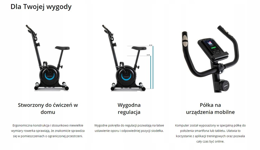 Сідло з м'яким наповнювачем забезпечує комфорт під час катання. Регулювання висоти в діапазоні 5 градусів дозволяє точно підлаштуватися під зріст людини, яка займається. Магнітний опір управляється за допомогою ручки, розташованої на рульовій колонці. Його 8 рівнів регулювання дозволяють регулювати навантаження відповідно до рівня підготовки та індивідуальних потреб спортсмена. Педалі мають нековзку поверхню та регульовані ремінці для стабілізації ніг під час тренування. На задньому стабілізаторі є поворотні накладки, які дозволяють вирівняти велосипед на нерівній поверхні.