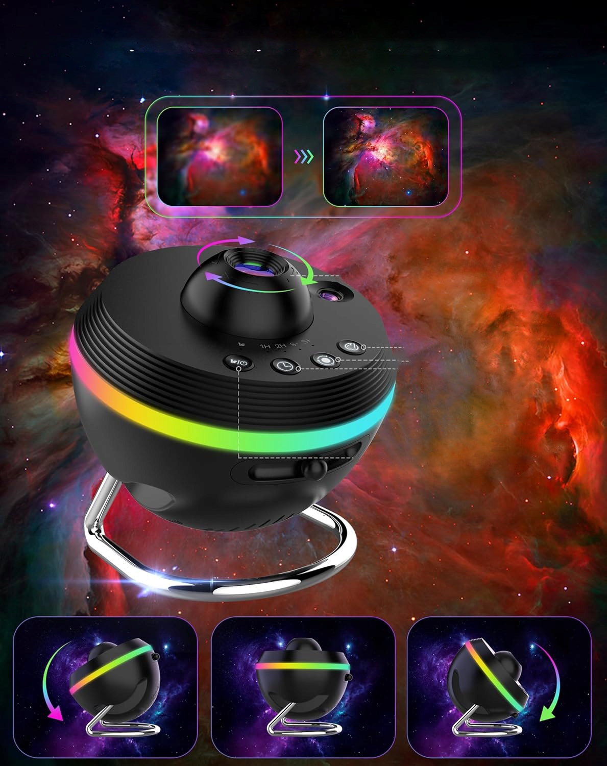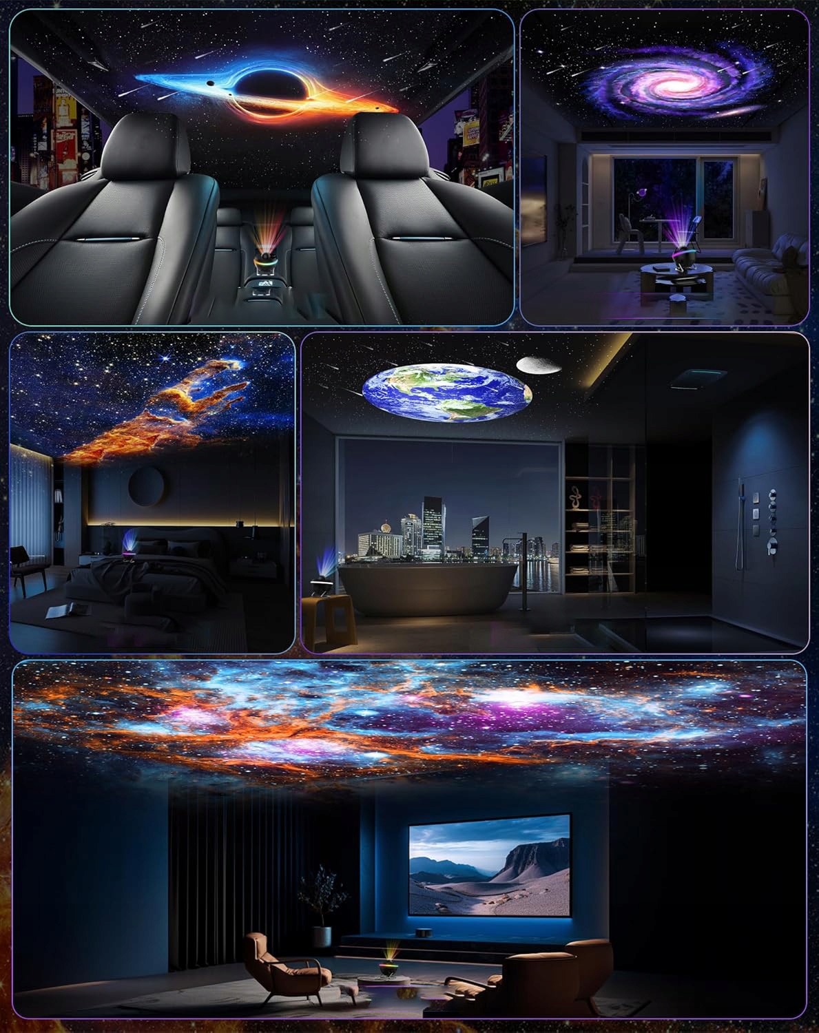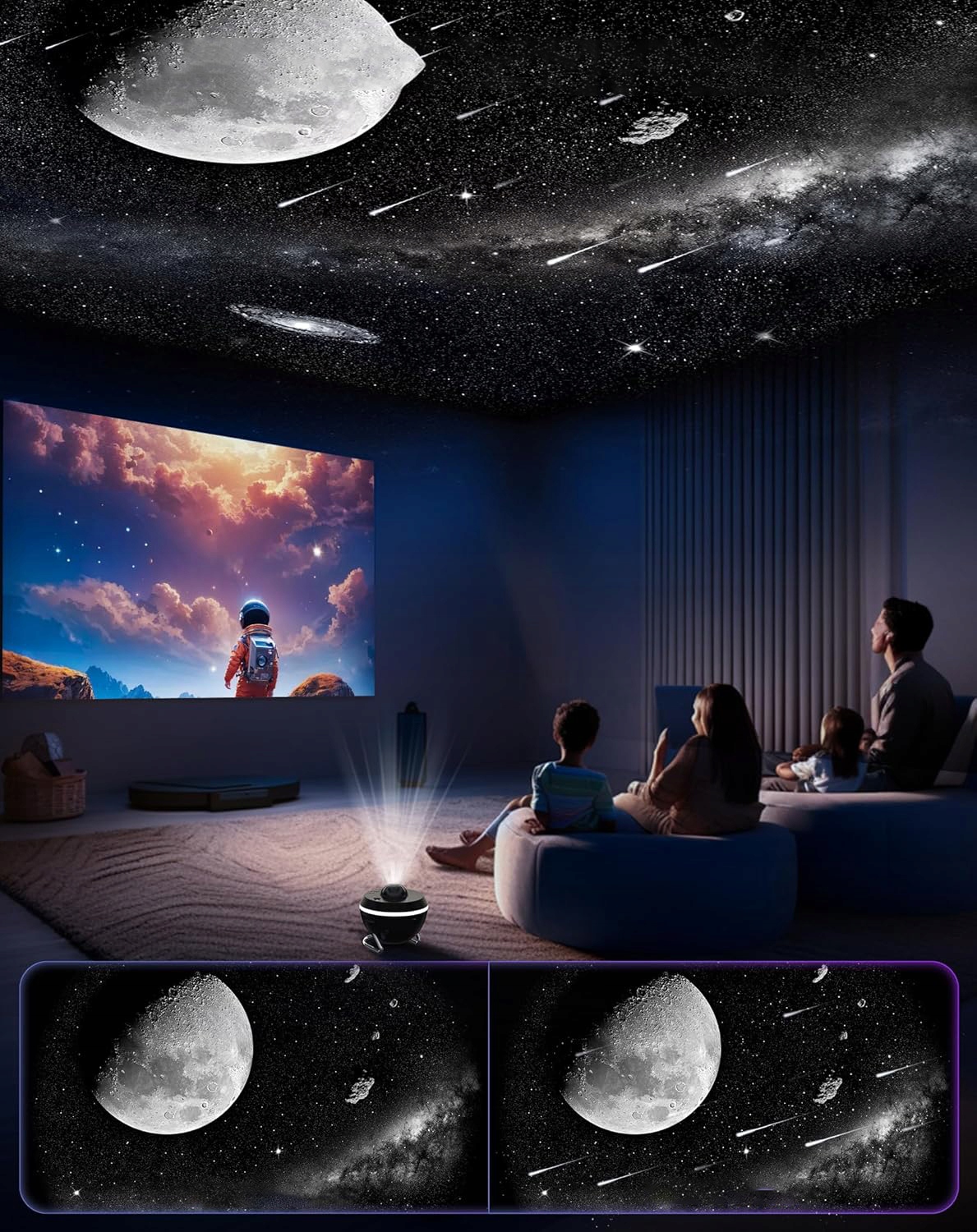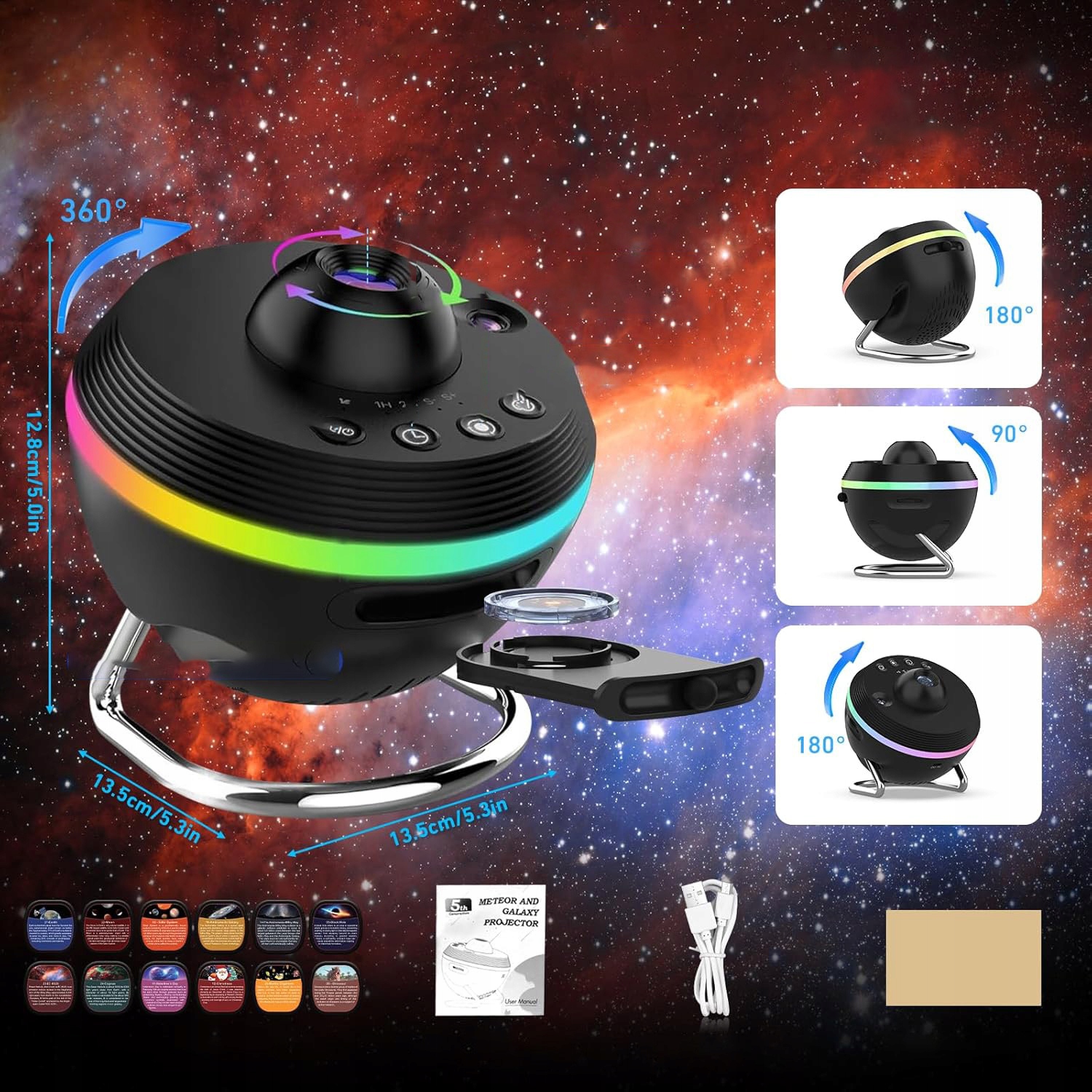 - Галактичний проектор із вдосконаленими проекційними технологіями демонструє живі, рухомі метеорити на стінах та стелях, створюючи спокійну та чарівну атмосферу. Кольори для створення ідеального настрою.