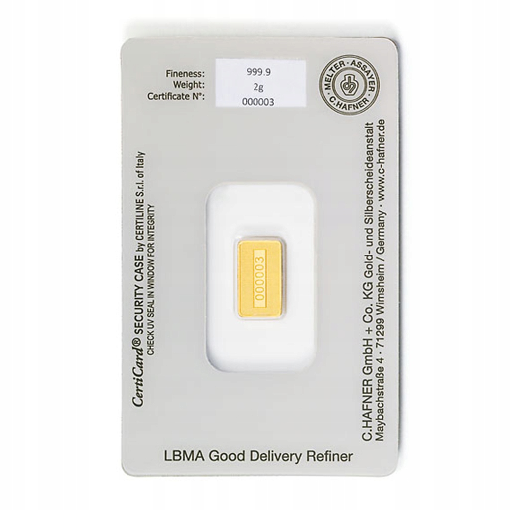 Злиток золота вагою 2 г і найвищою чистотою 999,9 (24 карати), виготовлений відомим заводом C.Hafner. Продукт має сертифікат автентичності та прийнятий у всьому світі.
