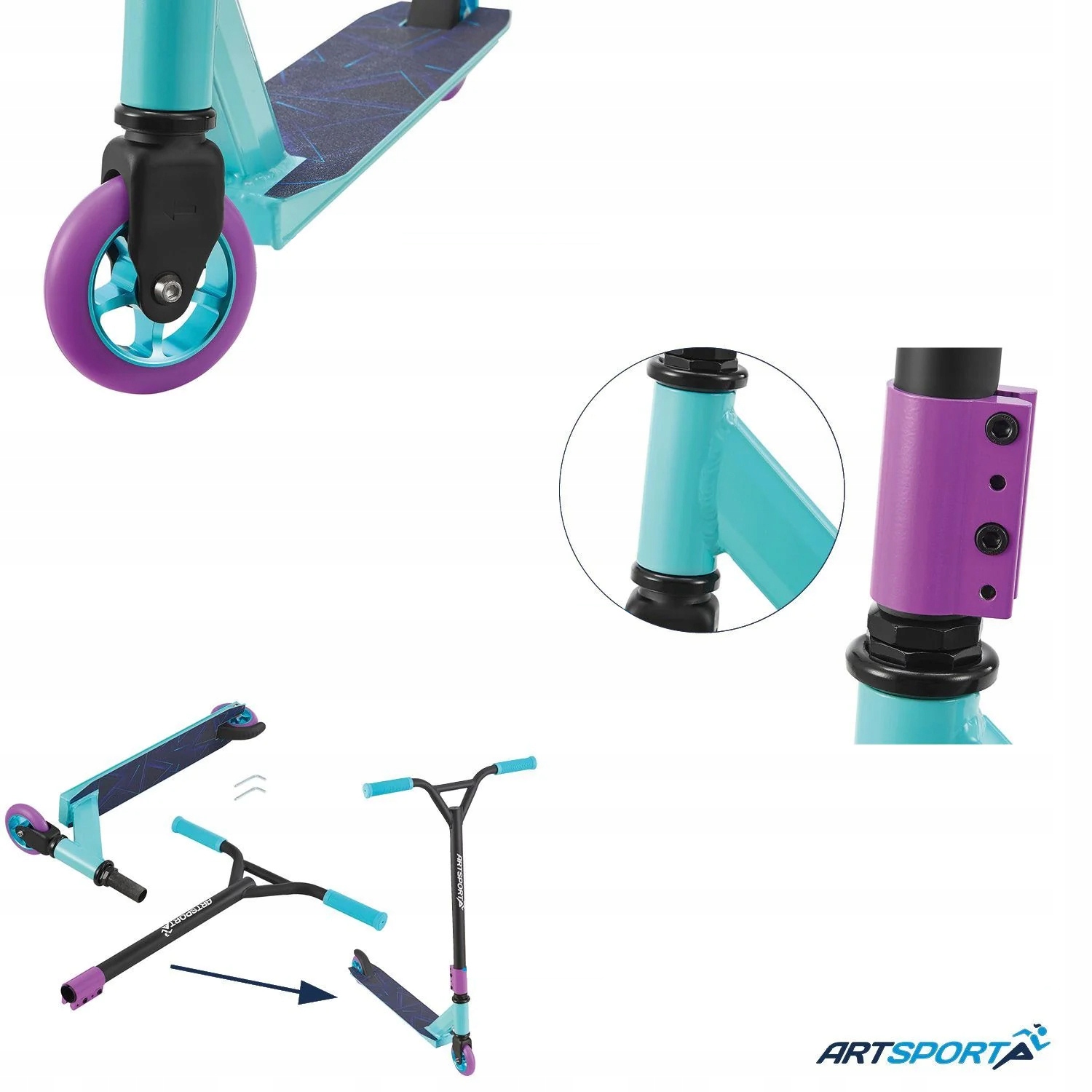 захоплюється катанням з каскадера Скутер ретро -фіолетового фіолетового німецького бренду Artsport® - скутер, створений для вражаючих трюків та гри в скейтпарку. Розроблений для дітей з 6 років та підлітків, які люблять рух та спортивний стиль. Завдяки легкій, але стабільній структурі, виготовленій з алюмінію та сталі, скутер забезпечує безпеку під час стрибків та акробатики.