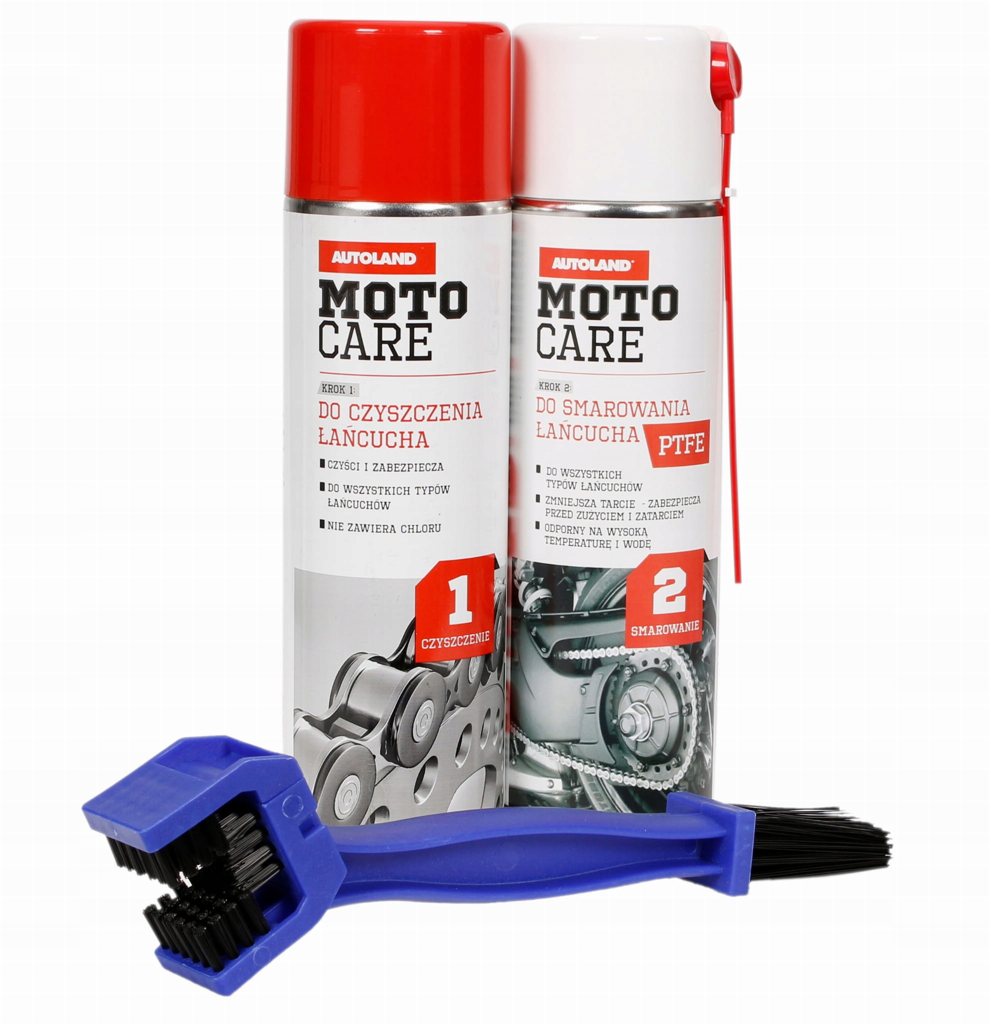 Набір з лінійки MOTO-CARE від AUTOLAND дозволить комплексно доглядати за приводом вашого мотоцикла, препарати пройшли перевірку і не призведуть до пошкодження ланцюга, яке може виникнути при використанні не адаптованих продуктів до ланцюгів з O-Ring, X-type Ring і Z-Ring