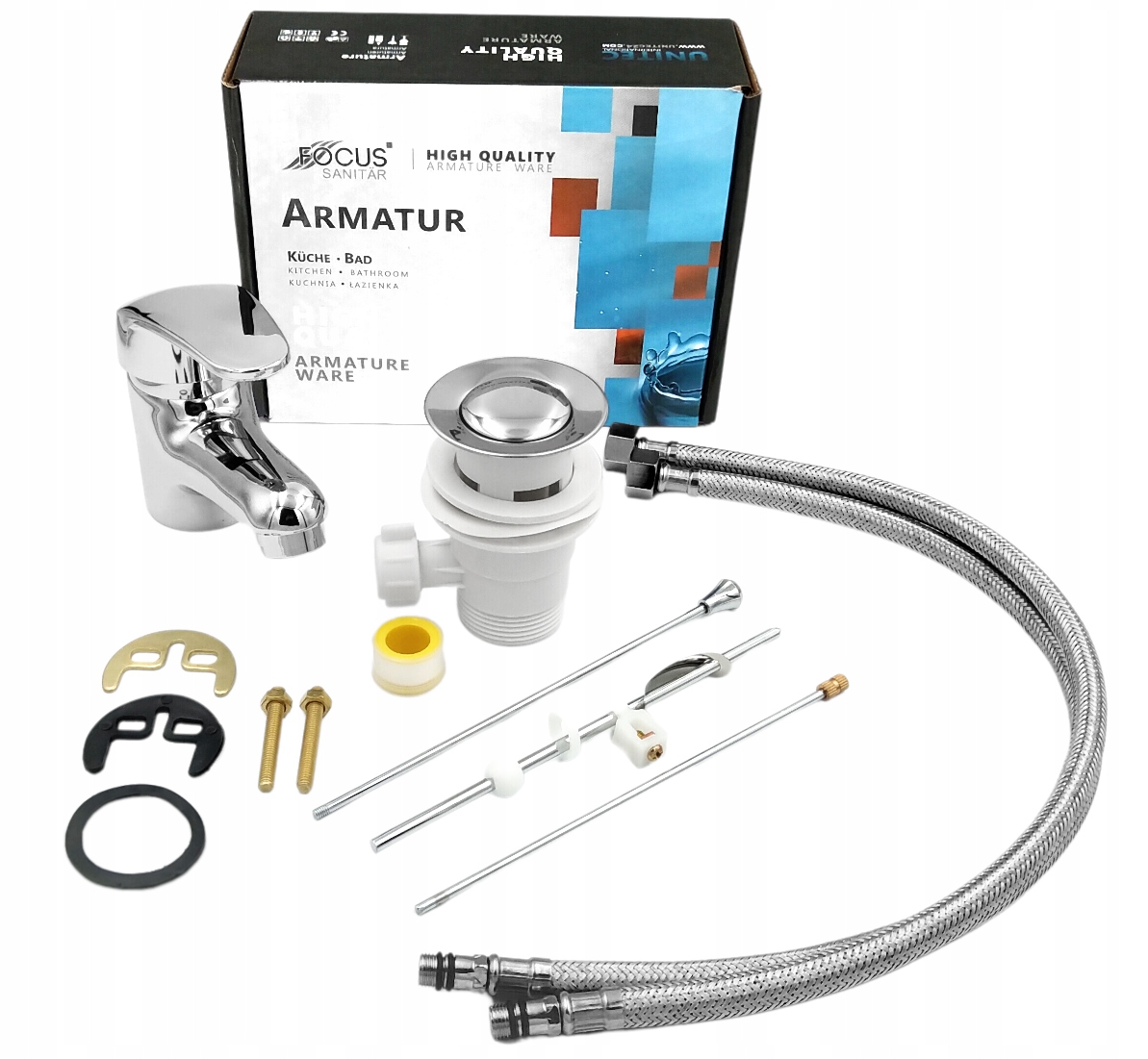 На додаток до змішувача комплект також містить елементи, необхідні для встановлення - два шланги, прокладки, гвинти.