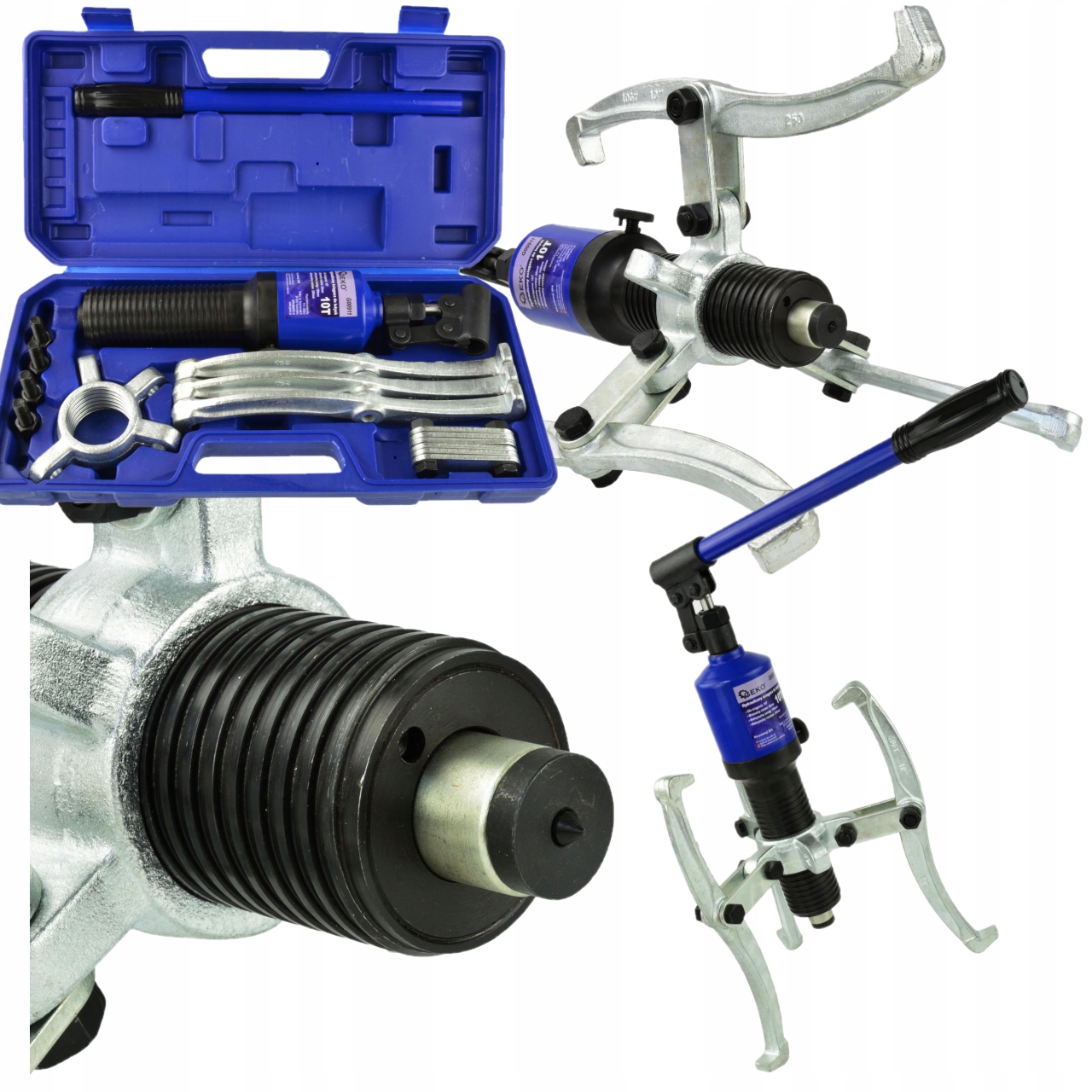 Знімач для підшипників, шестерень тощо. Завдяки своїй гідравлічній конструкції він забезпечує значну тягову силу. На відміну від витягувачів різьблення, немає сили скручування, яка може спричинити ковзання інструменту. Простота використання: потужність передається поступово і без зусиль. Підвищена безпека: висока міцність і запобіжний клапан. У набір входить набір монтажних кігтів.