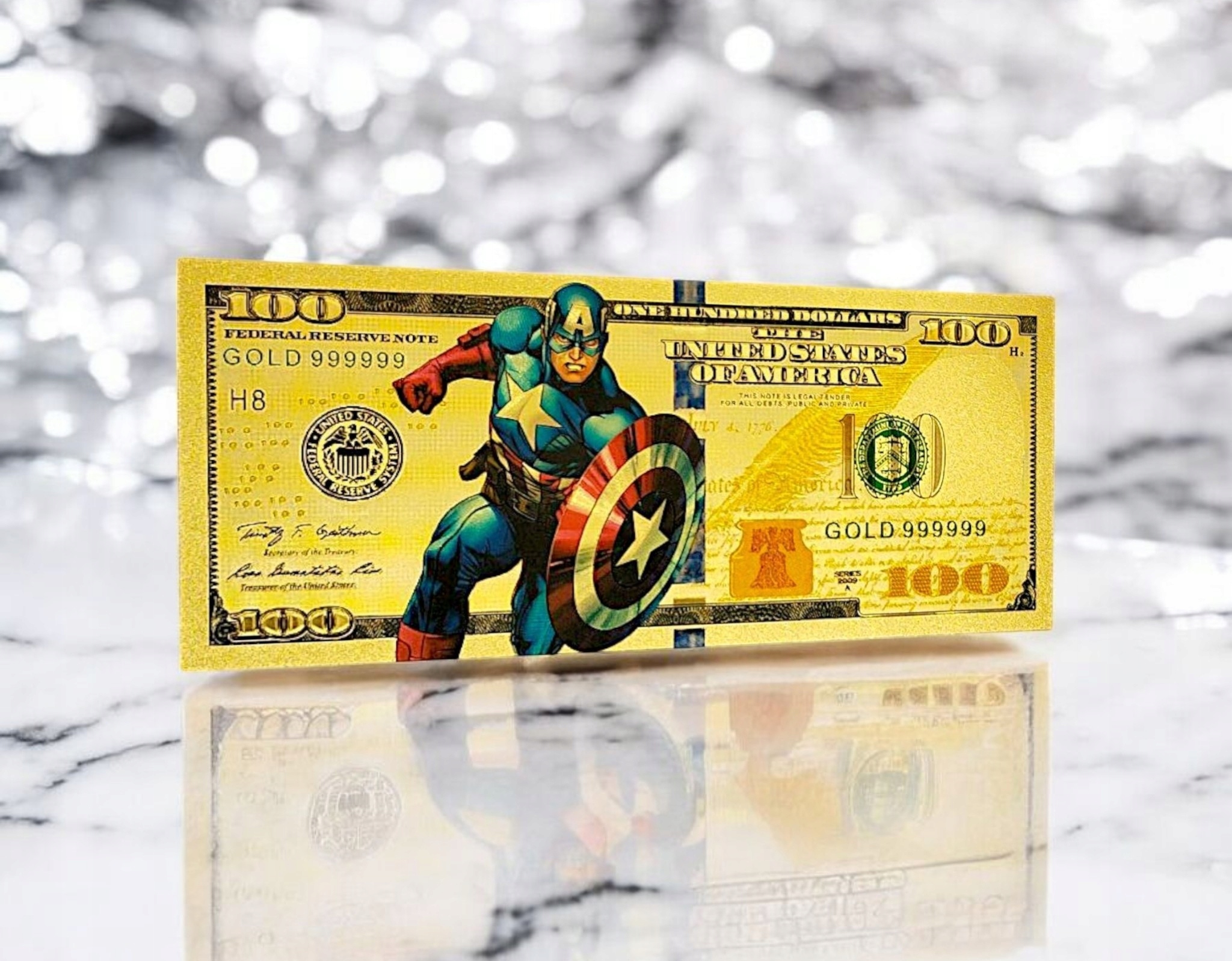 Додайте до своєї колекції невелику силу супергероя завдяки цій незвичайній банкноті із зображенням капітана Америки! Ця фантазійна банкнота з номіналом у розмірі 100 доларів була виготовлена з постійного пластику з ПВХ і покрита блискучою золотою плівкою, що робить його унікальним об'єктом колекціонера для кожного фаната Месників та світу Marvel.