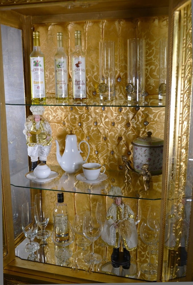 - Матеріал: Золота деревина, візерункова тканина, декоративні ґудзики - кристали, скляні полиці