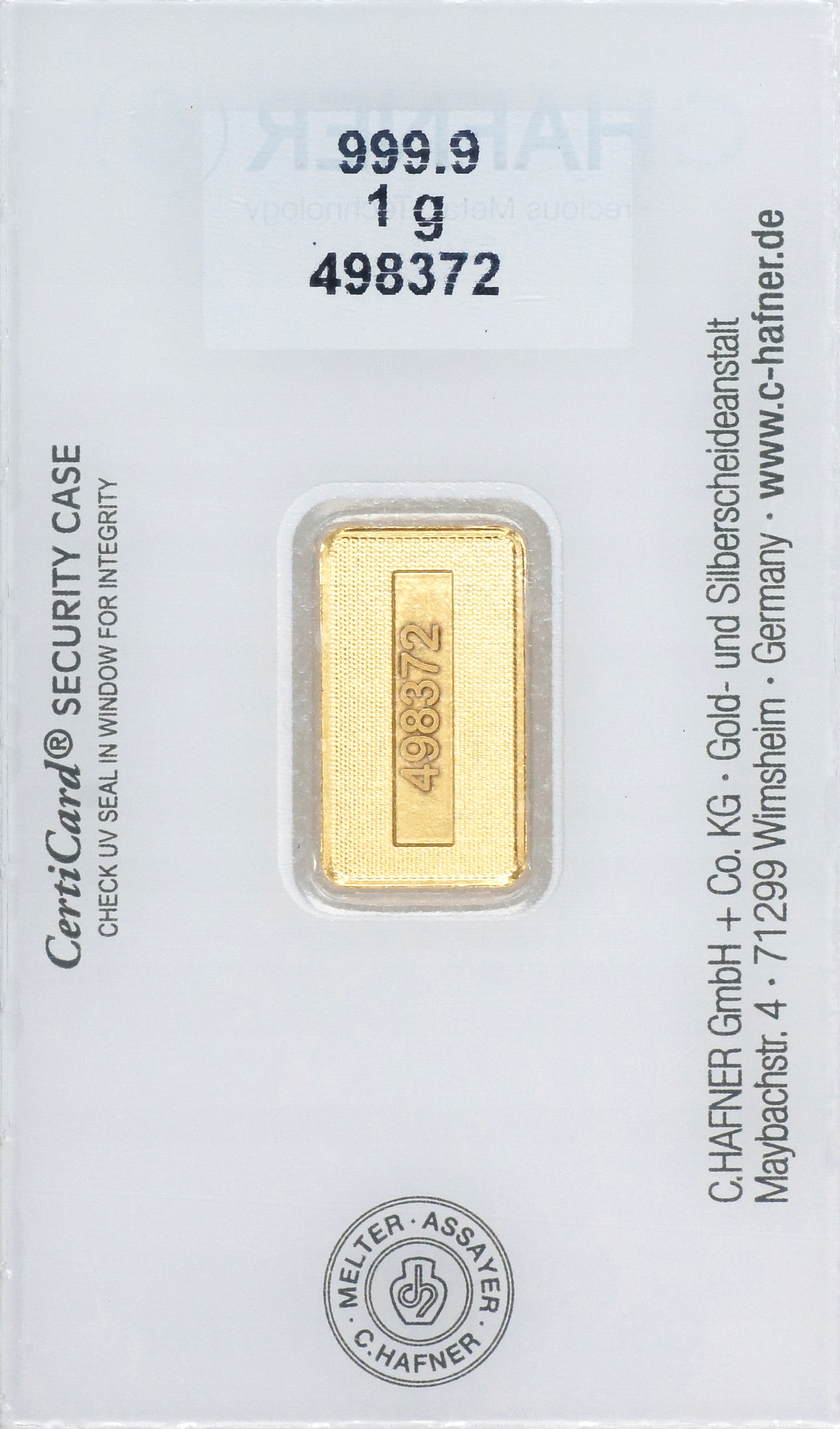 Однограмові золоті злитки від відомого LBMA- затвердженого виробника C. Hafner пропонуються в елегантному футлярі розміром з кредитну картку з унікальним серійним номером на панелі та на упаковці.