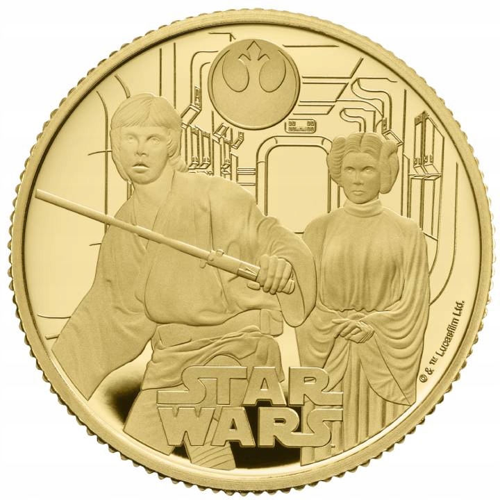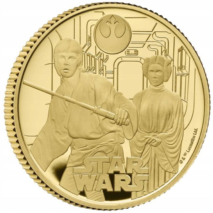 Зоряні війни: Люк Скайуокер та принцеса Лея 1/4 Золото 2023 Доказ - третя монета з серії "Зоряні війни". Значення є нумізматичним унікальним для шанувальників знакової космічної саги. Зоряні війни - це вигаданий Всесвіт, створений Джорджем Лукасом. Перший фільм відбувся в 1977 році. Продукт представляє Люка Скайуокера та принцеси Леї - двох ключових персонажів, які відіграють ключову роль у "Зоряних війнах". Кількість вартості - 500 штук. Крім того, ця незвичайна копія була створена монетним двором королівського монетного двору. Продукт був розміщений в оригінальній упаковці. Монета має гарантію уряду Великобританії щодо її законності, чистоти руди та походження металу, а також є повним засобом оплати в країні емітента. Skywalker та Princess Leia та напис "Зоряні війни" та інформація про авторські права, що належать до Lucas Film Ltd.