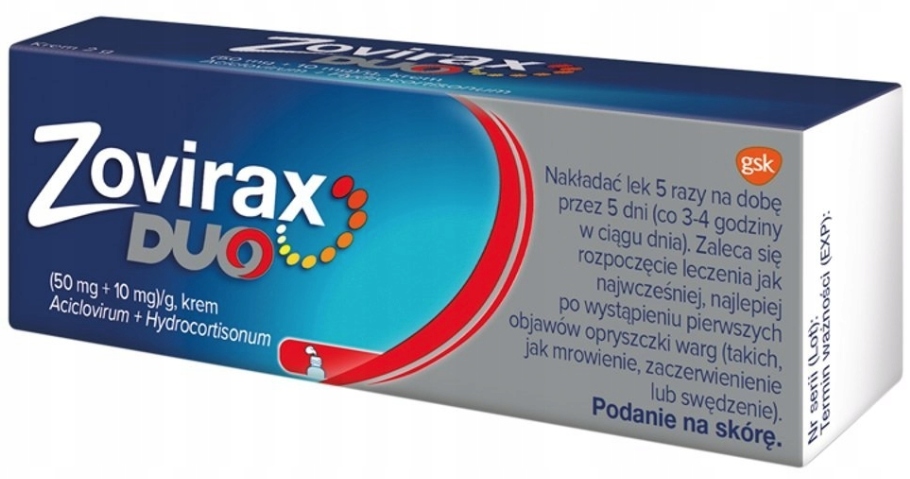 Дует з медицини Zovirax Крем використовується при лікуванні ранніх ознак губ герпесу та шкіри навколо рота, таких як поколювання, свербіж або почервоніння, щоб зменшити ризик перетворення герпесу в ураження сечового міхура у дорослих та підлітків у віці 12 років. Антивірусне для герпесу з антивірусним ефектом, що допомагає лікувати ранні симптоми рецидивуючого герпесу та зменшує ймовірність його повторного спостереження.