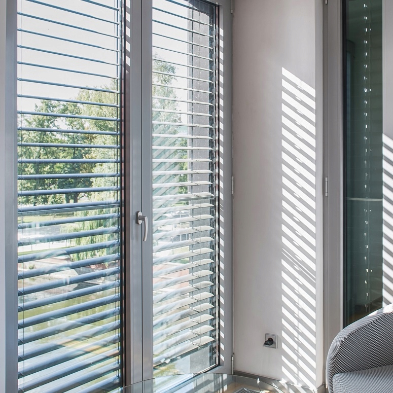 Форма ламелей C80F дозволяє щільно згорнути пакет ламелей, так що в згорнутому стані штора займає мало місця. Ідеальне рішення там, де через брак місця немає можливості встановити інші фасадні жалюзі