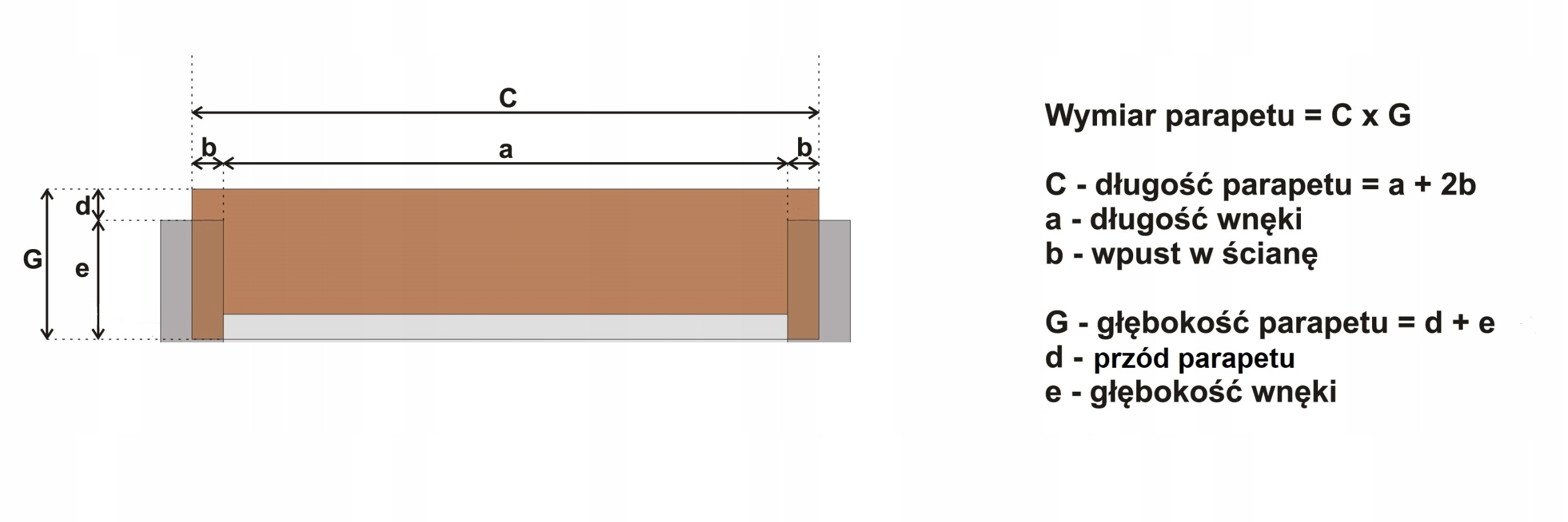- Ширина підвіконня (G) = глибина віконної ніші (e ) плюс приблизно 3-4 см (d), щоб підвіконня виступало вперед