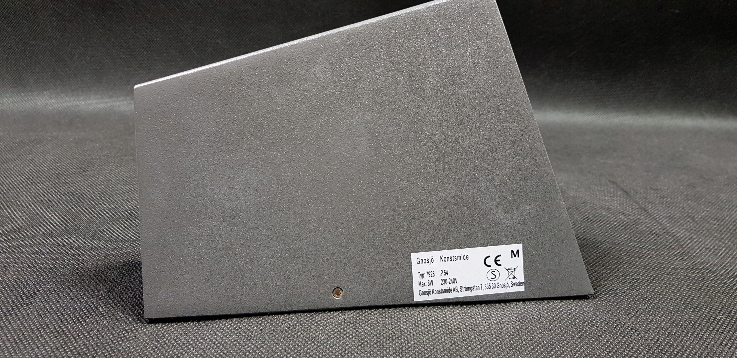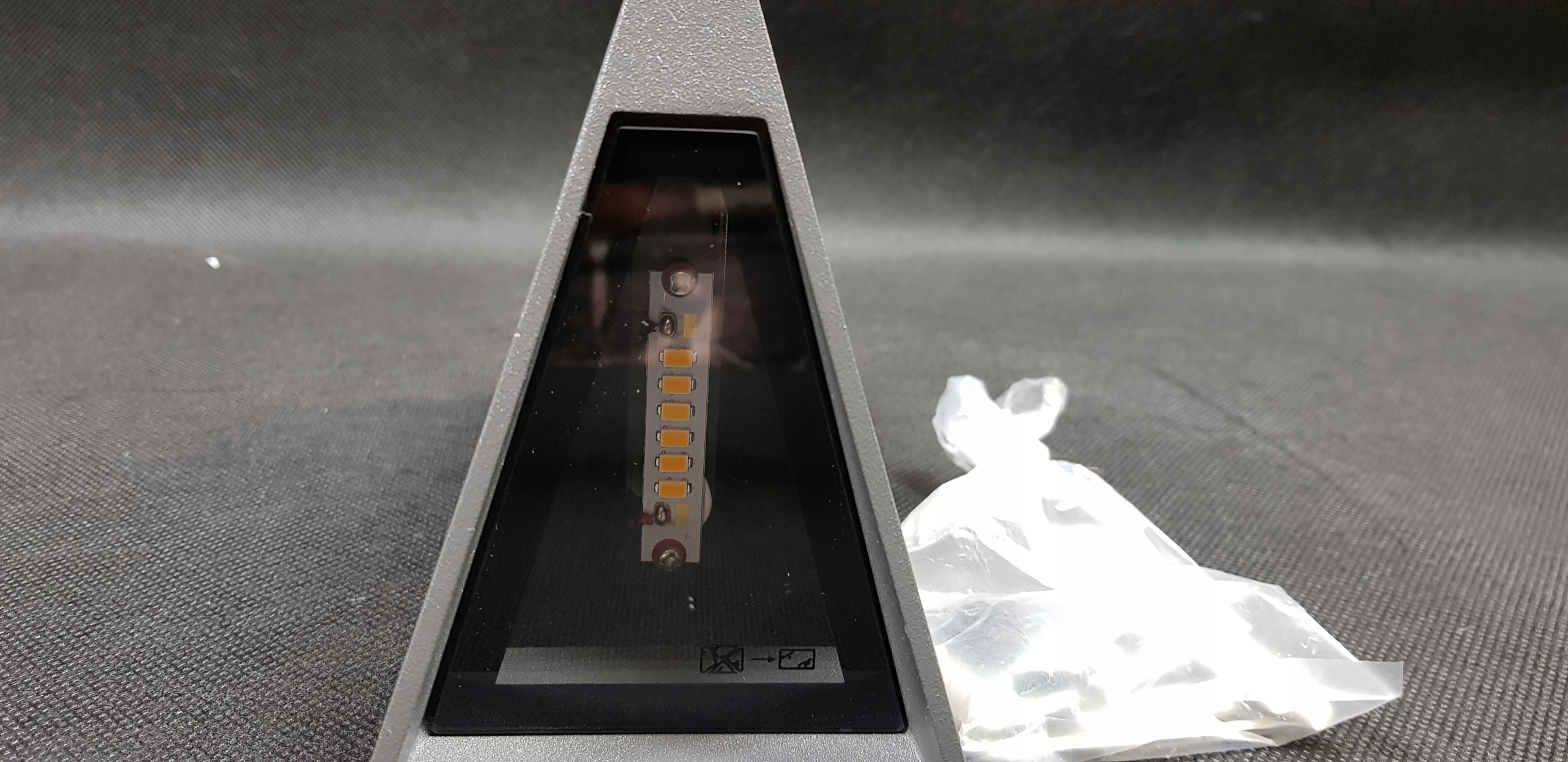 Стійкий металевий корпус із малопотужними світлодіодними модулями з джерелом світла 2 x 4 Вт (2 x 250 лм). Забезпечує ширший промінь (45 градусів) і вужчий промінь (20 градусів) вгору. Колірна температура світла тепла 3000 К. Клас захисту IP54.