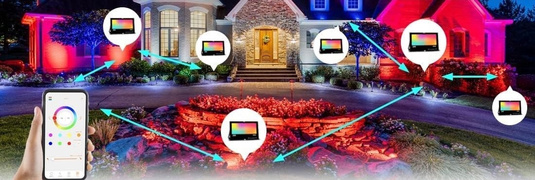 - Інтелектуальне групове керування Зовнішній RGB-прожектор оснащено чіпом Bluetooth 5.0, який може керувати кількома джерелами світла для групового керування. Ви можете автоматично визначати одне з головних джерел світла та керувати всіма проекторами через з’єднання Bluetooth мобільного телефону, яке легко контролювати та має стабільне з’єднання.
